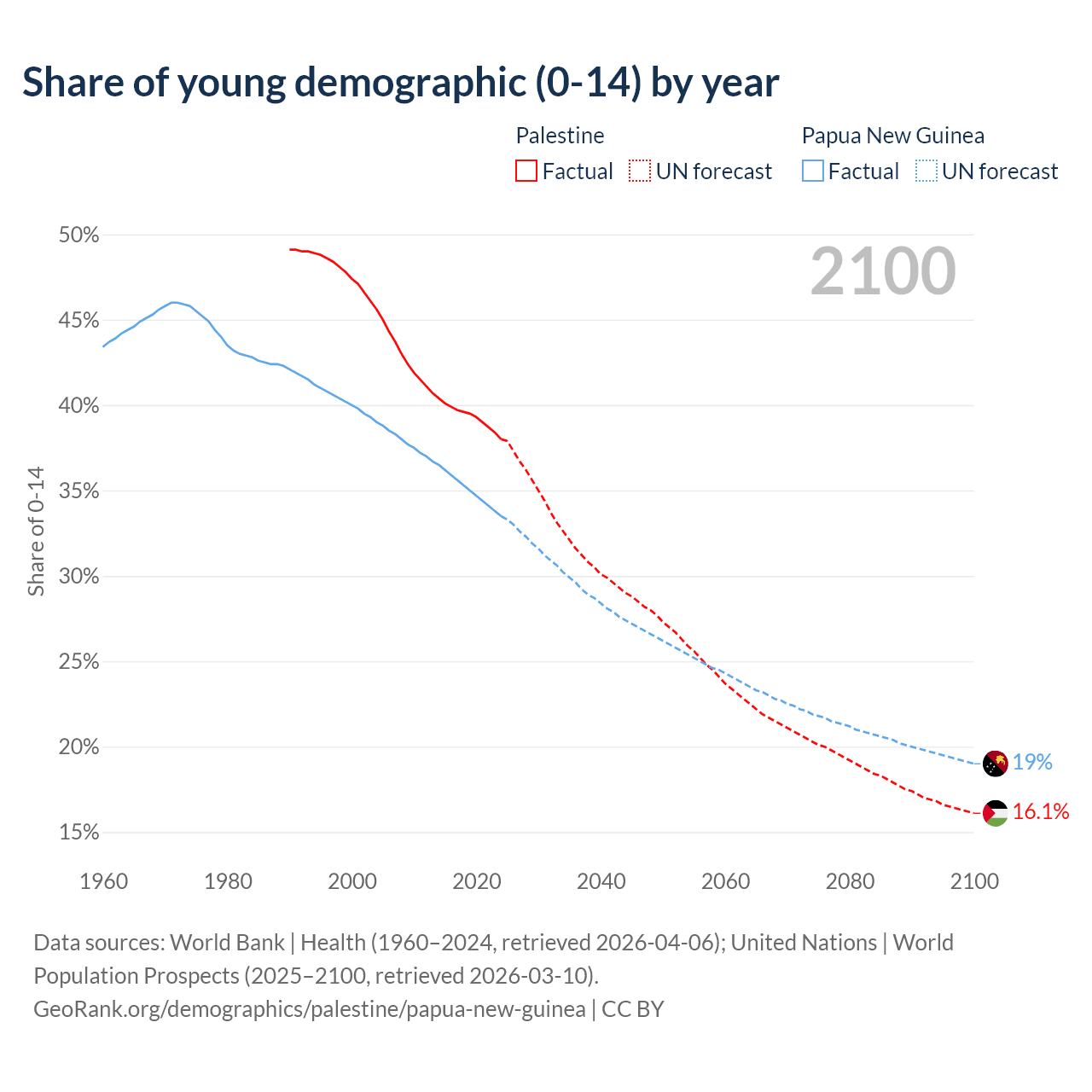 - The share of young demographic (0-15 years old) in Palestine is 38% vs 33.5% in Papua New Guinea.