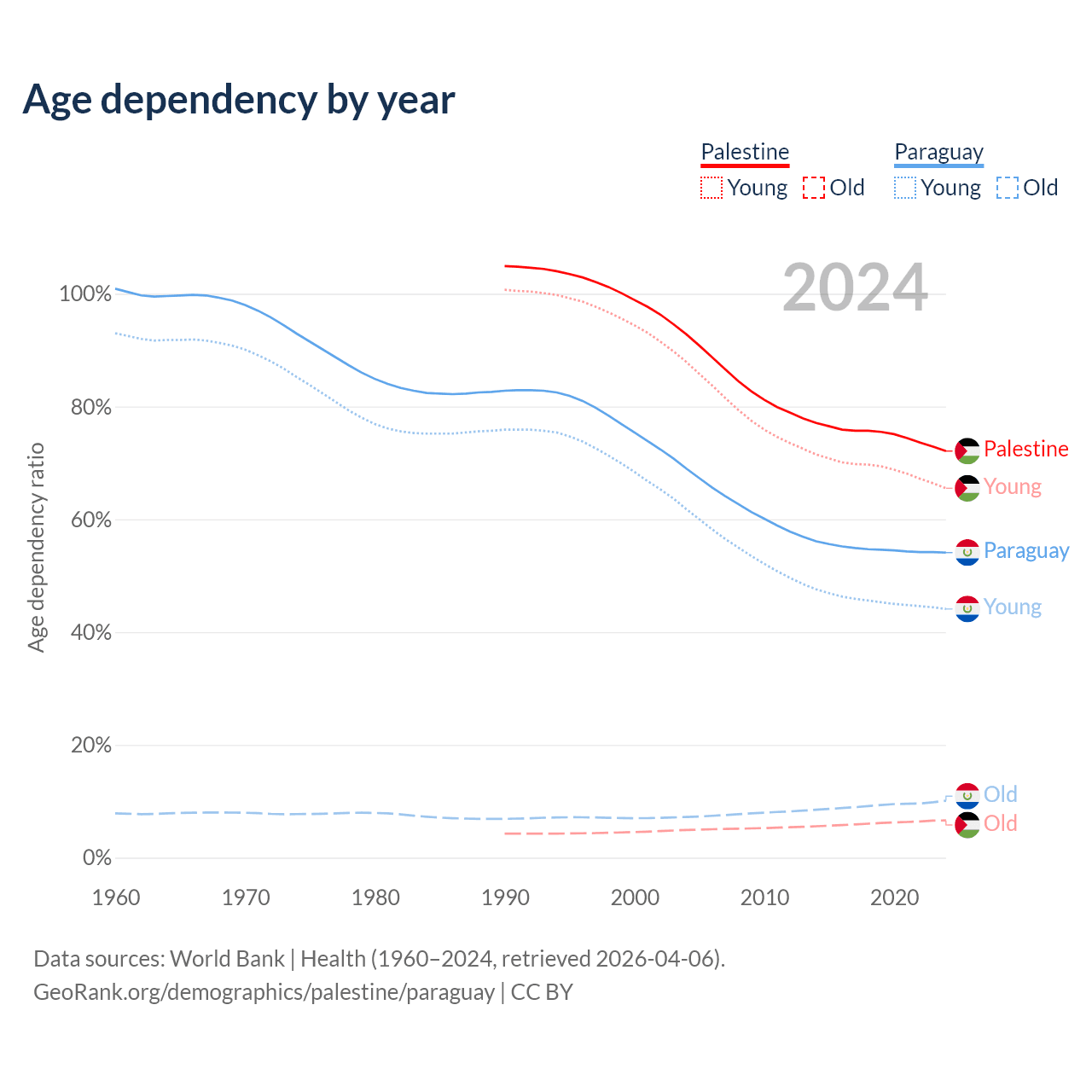 Data sources: World Bank | Health (1960–2024, retrieved 2026-04-06); U.S. Census Bureau (1960–2024, retrieved 2026-02-08).