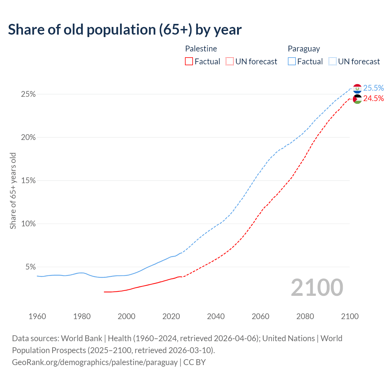 The share of older people aged 65 and over is 3.84% in Palestine and 6.54% in Paraguay. Life expectancy in Palestine compared to Paraguay .