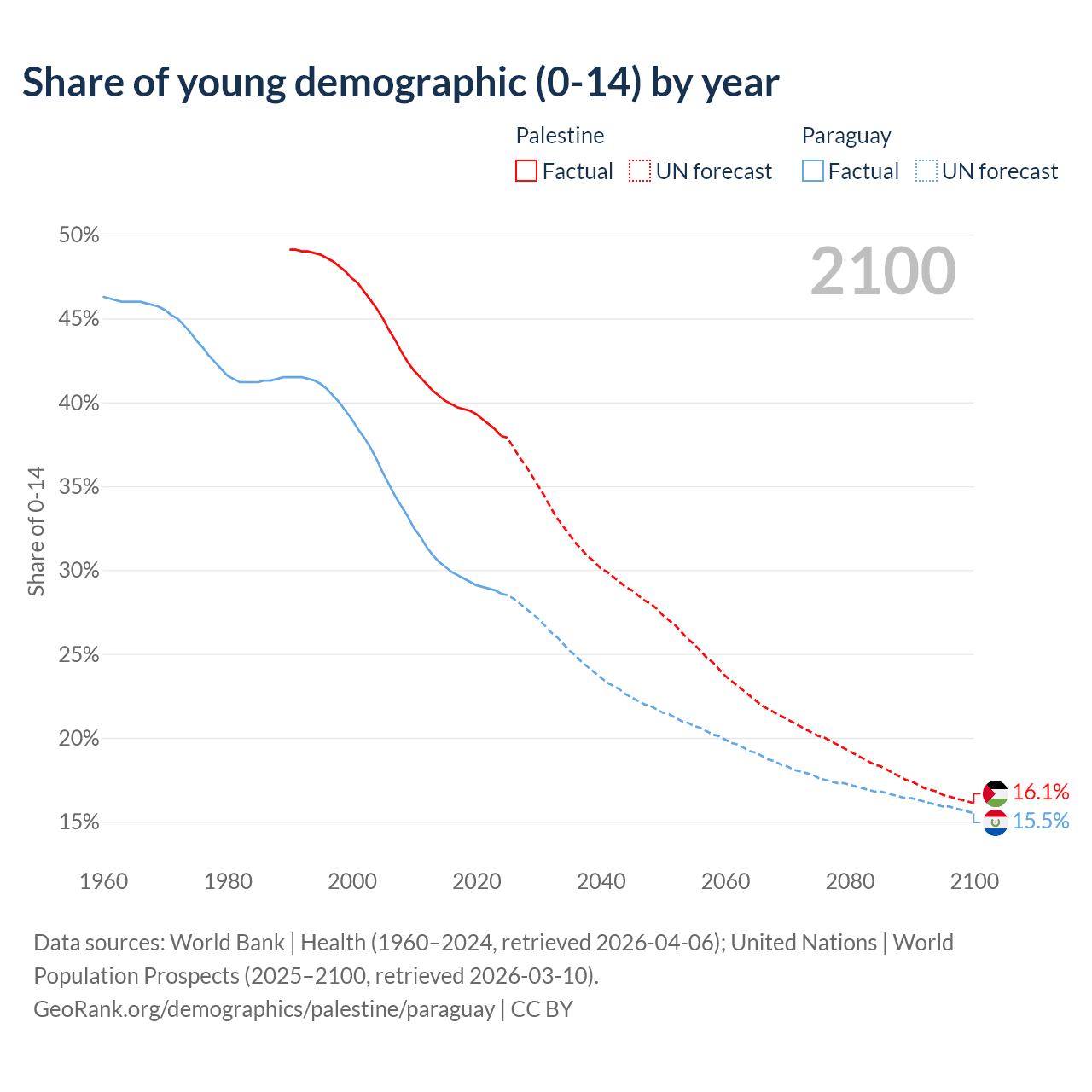 - The share of young demographic (0-15 years old) in Palestine is 38% vs 28.6% in Paraguay.