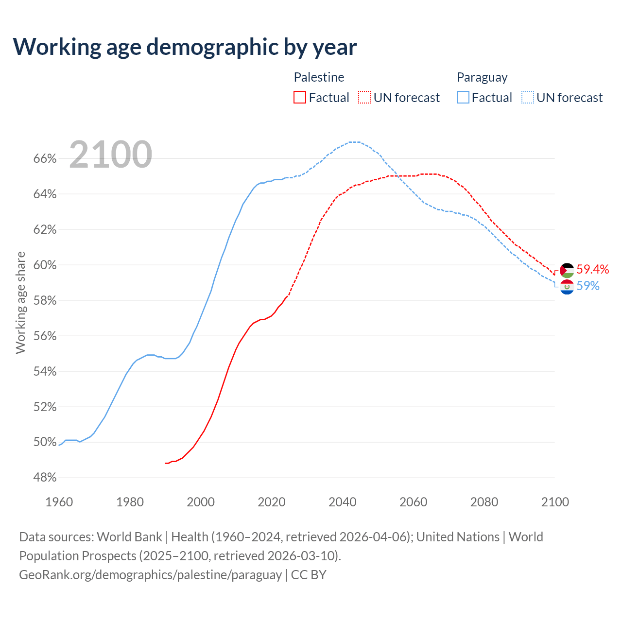 - The share of old-age demographic (65+) in Palestine is 3.84% vs 6.54% in Paraguay.