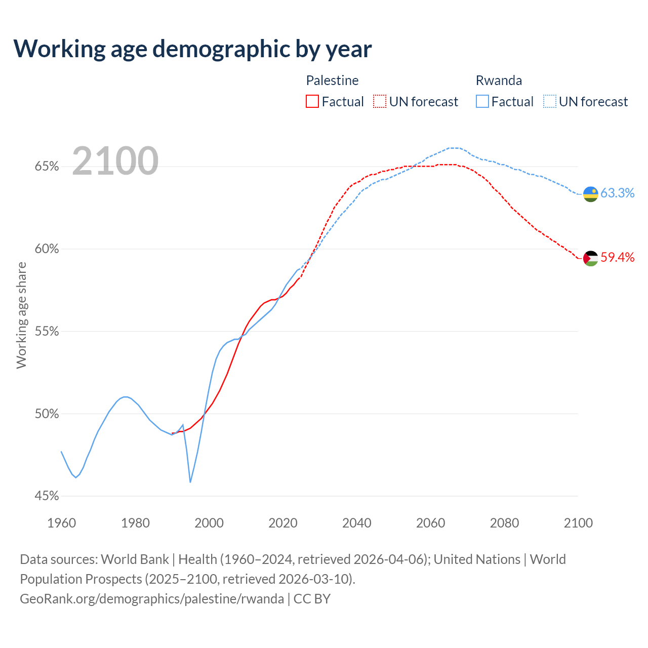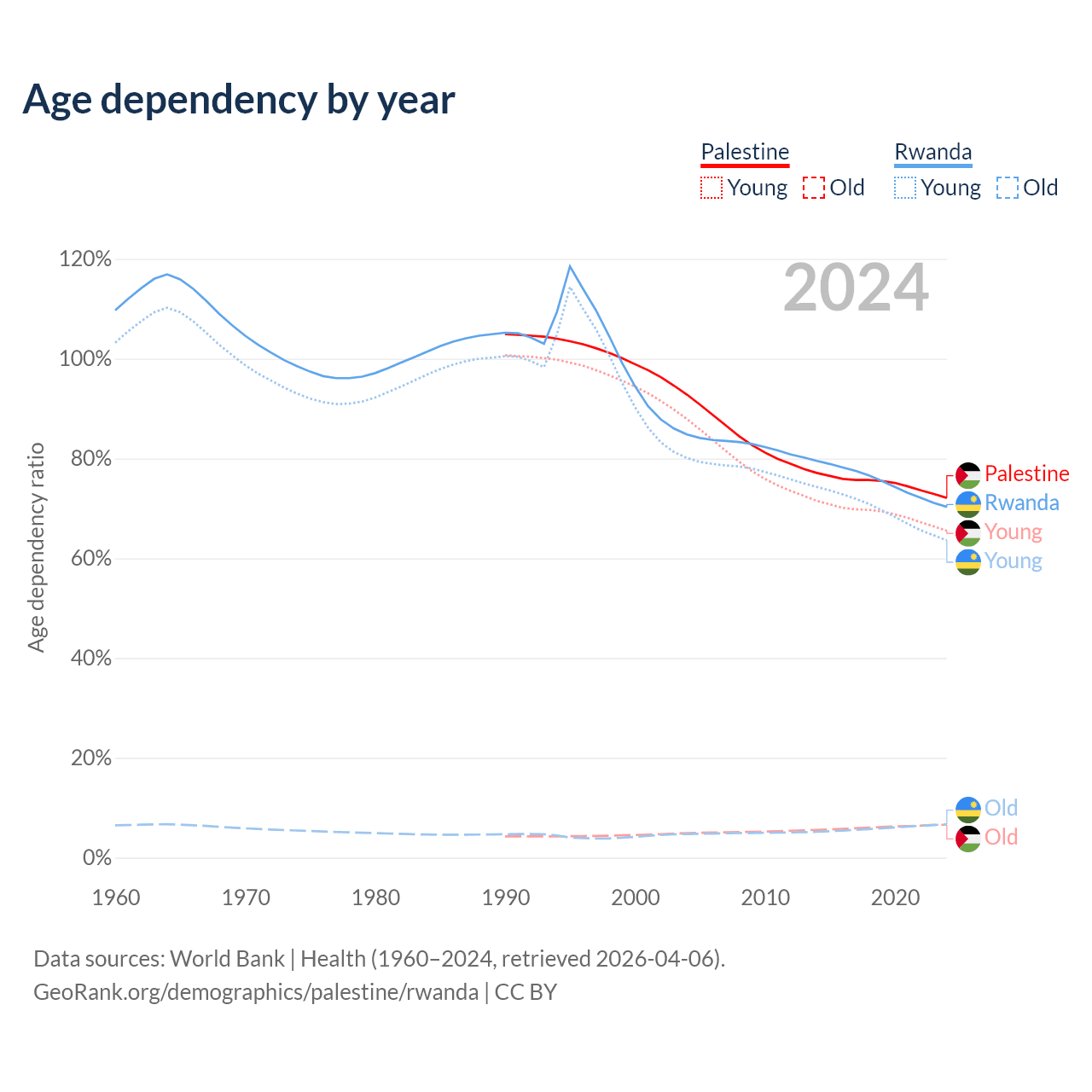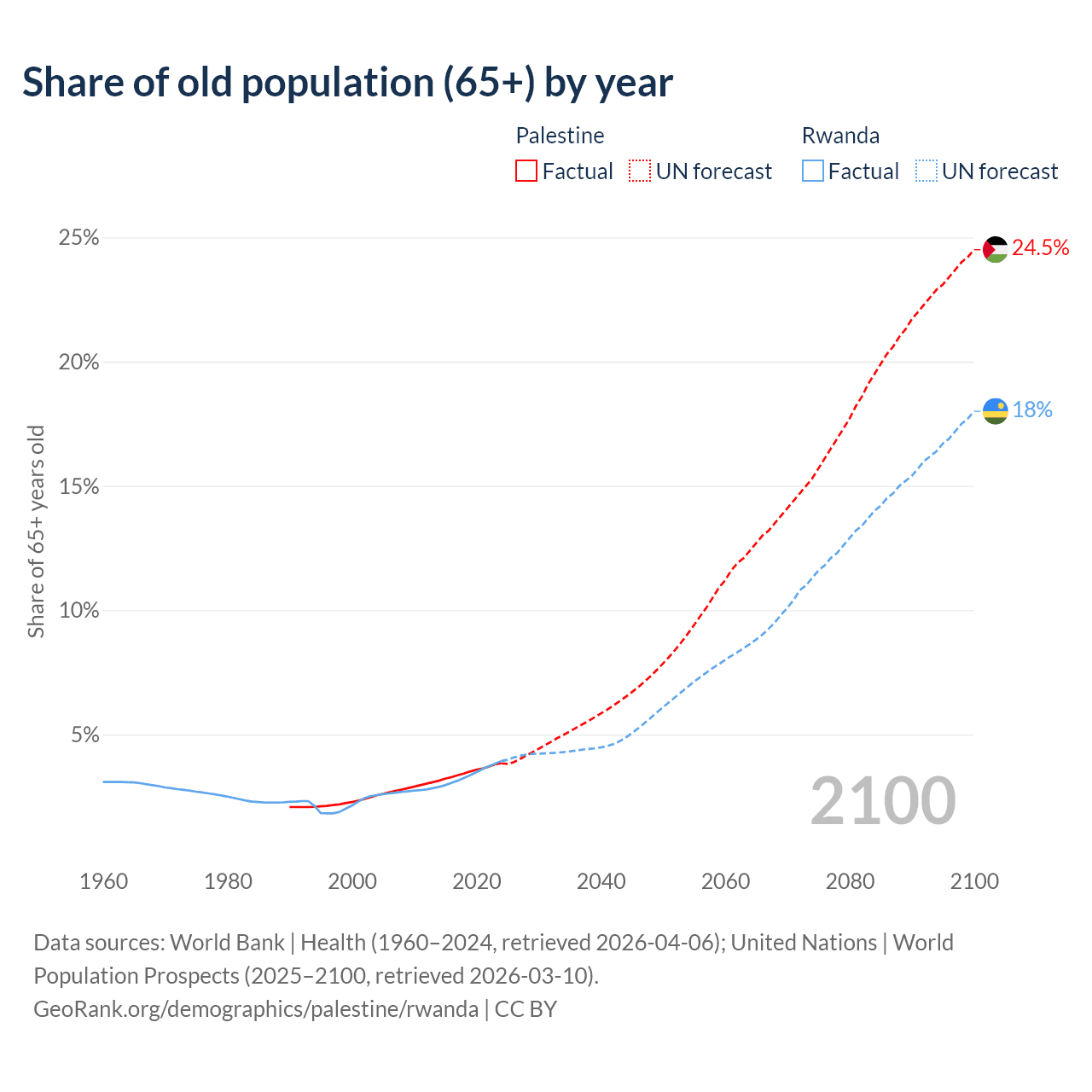 - The share of old-age demographic (65+) in Palestine is 3.84% vs 3.93% in Rwanda.