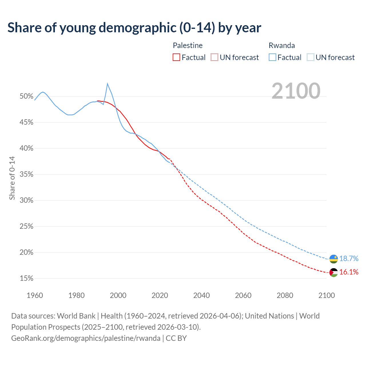 - The share of young demographic (0-15 years old) in Palestine is 38% vs 37.4% in Rwanda.