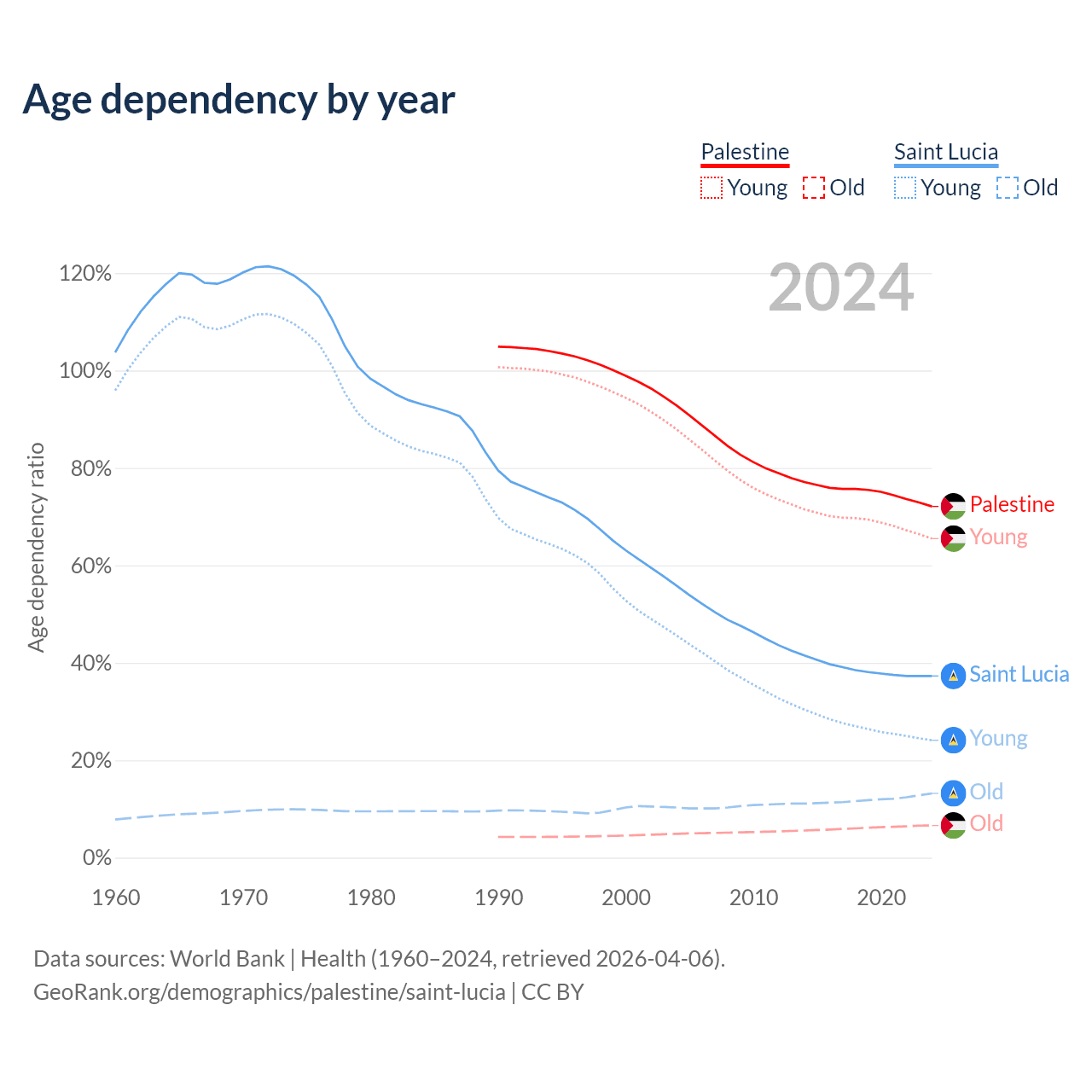 - The share of old-age demographic (65+) in Palestine is 3.84% vs 9.62% in Saint Lucia.