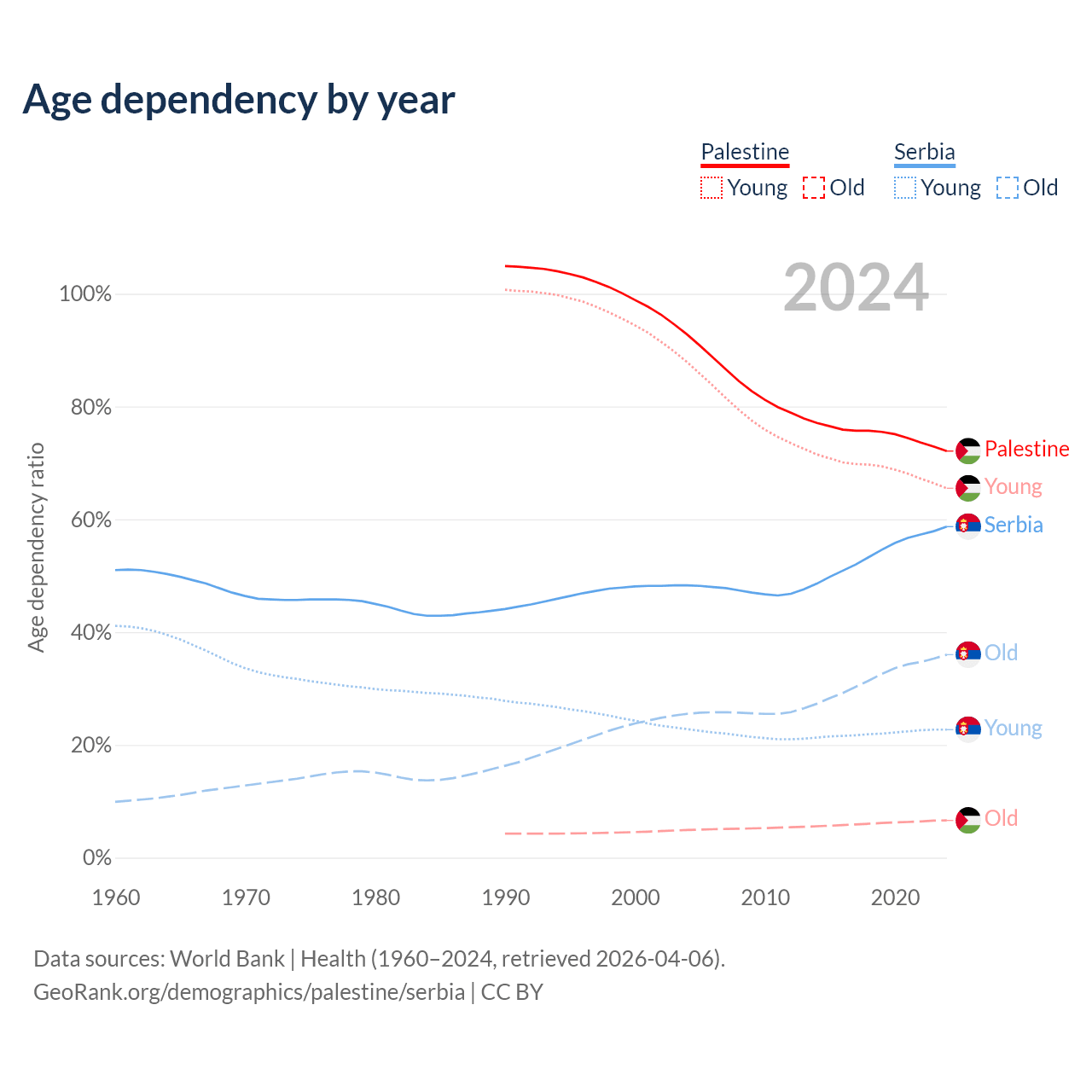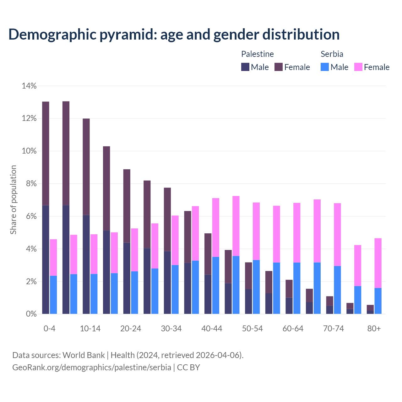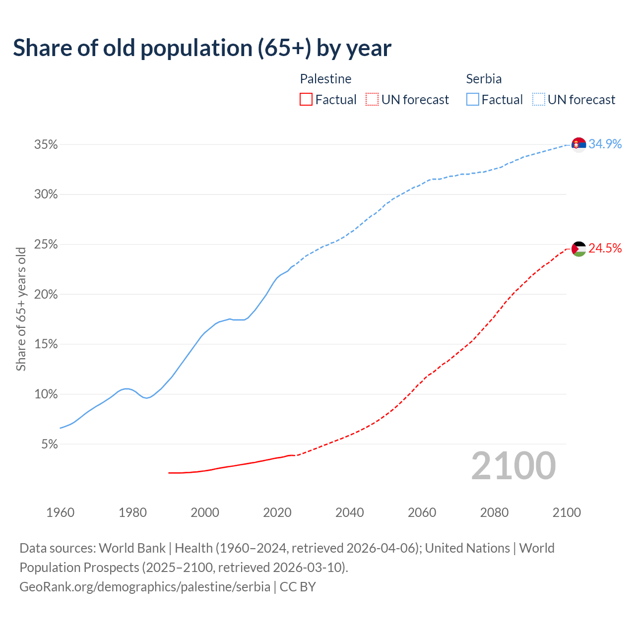 The share of older people aged 65 and over is 3.84% in Palestine and 22.7% in Serbia. Life expectancy in Palestine compared to Serbia .