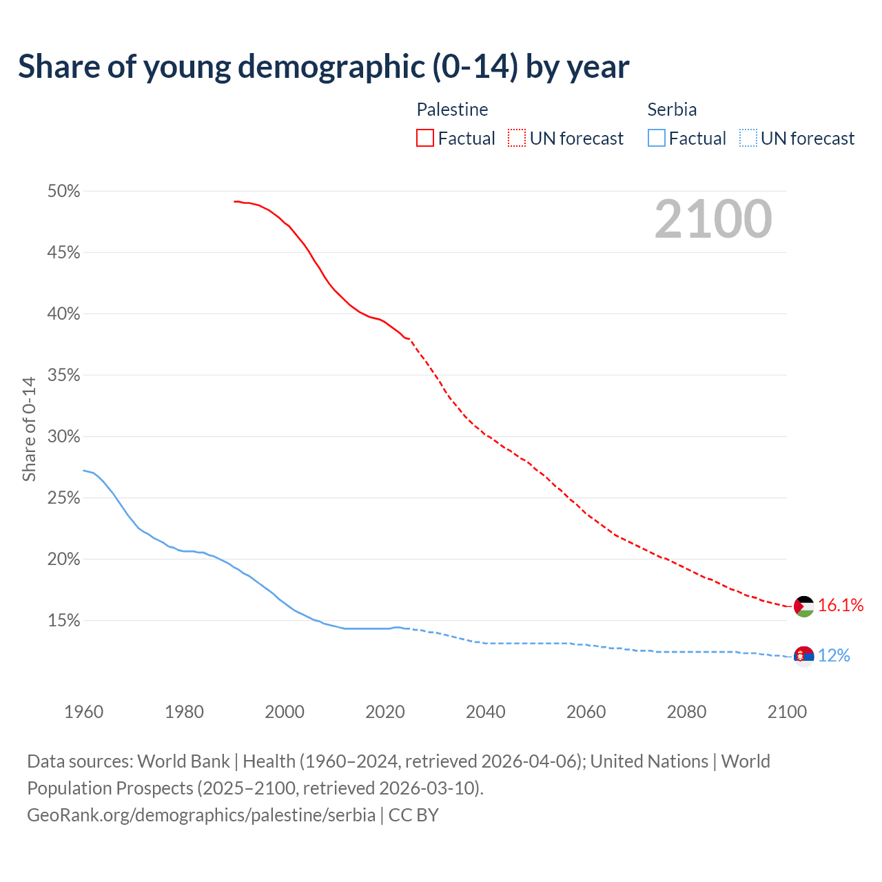 - The share of young demographic (0-15 years old) in Palestine is 38% vs 14.3% in Serbia.