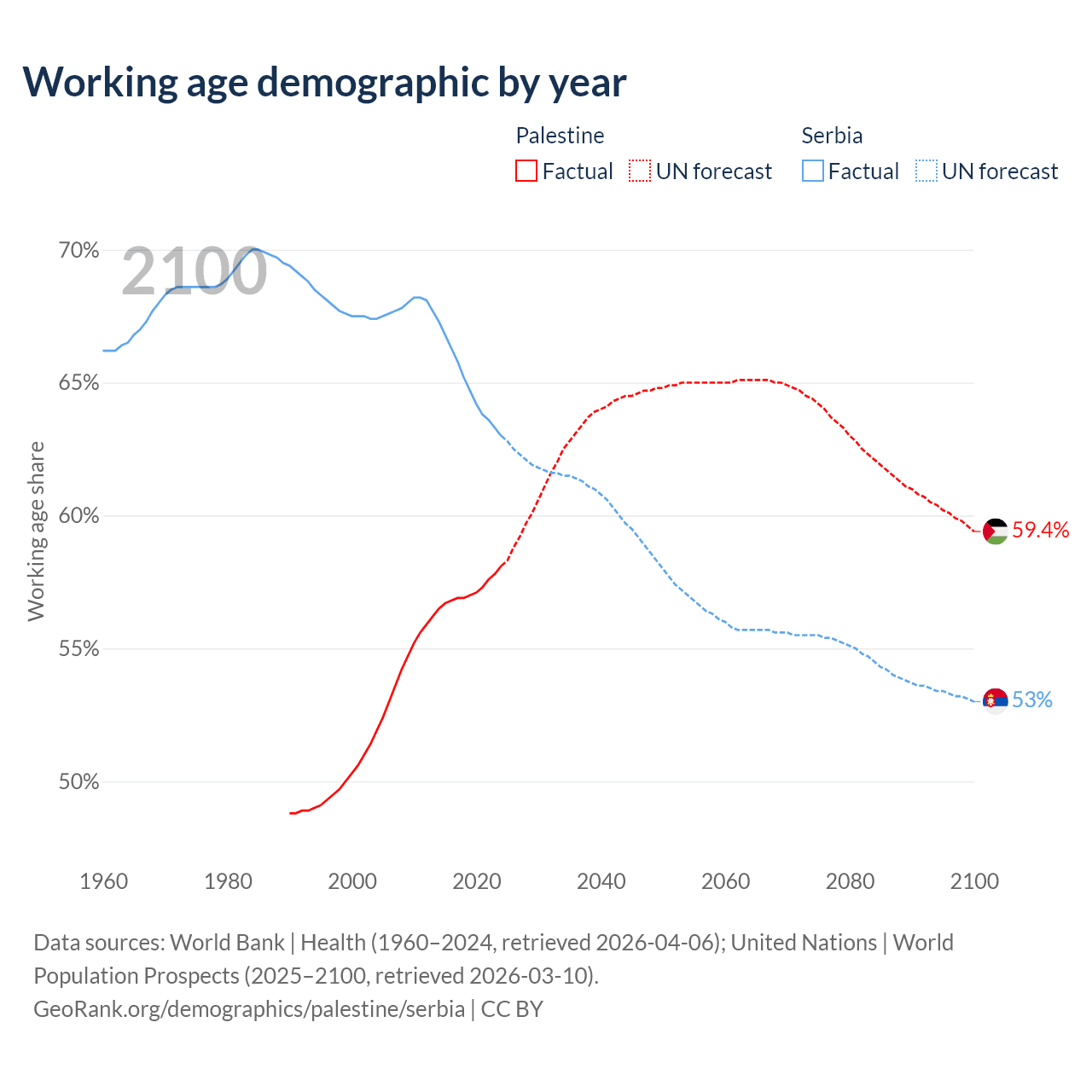 Median age Palestine vs Serbia, 1960-2100