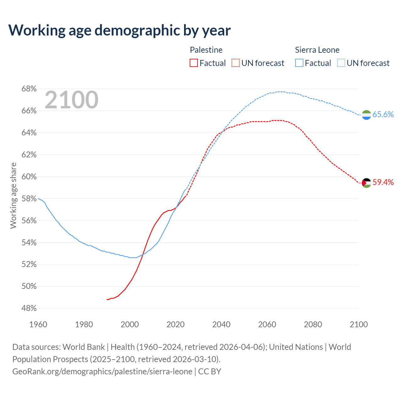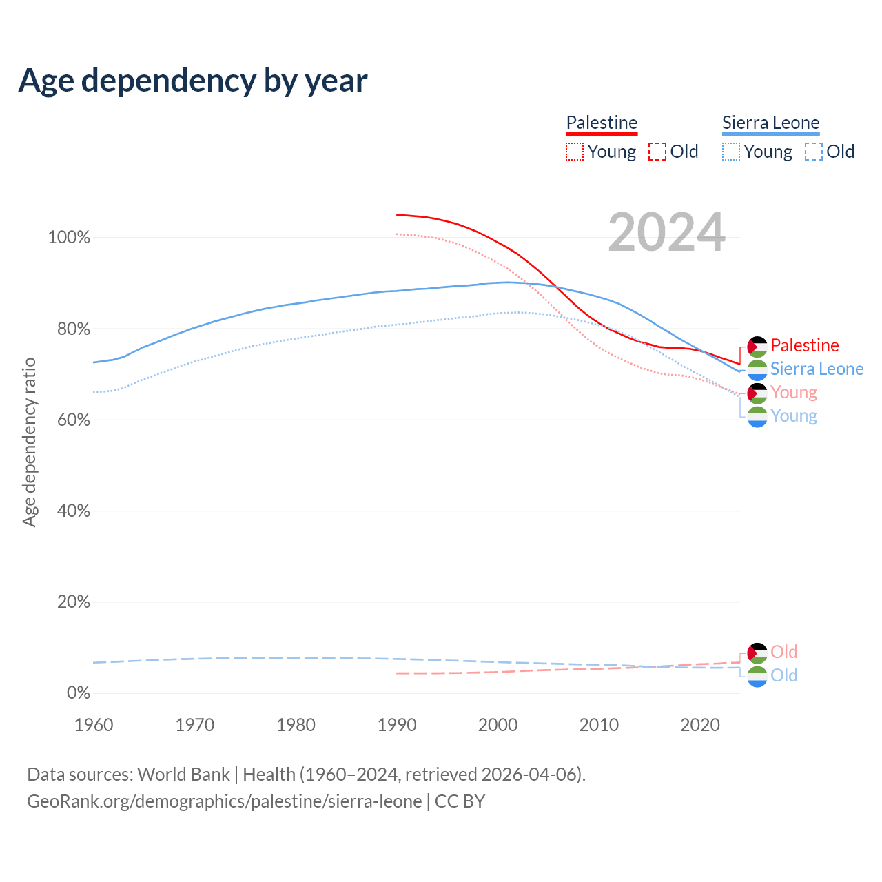 - The share of old-age demographic (65+) in Palestine is 3.84% vs 3.24% in Sierra Leone.