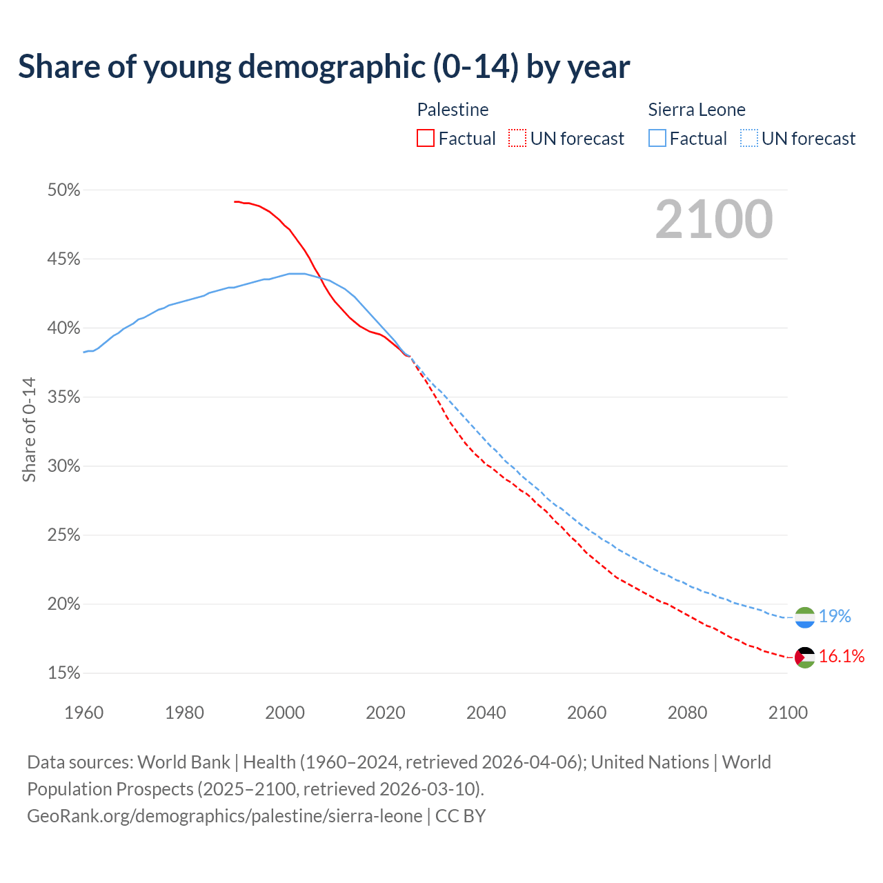 - The share of young demographic (0-15 years old) in Palestine is 38% vs 38.1% in Sierra Leone.