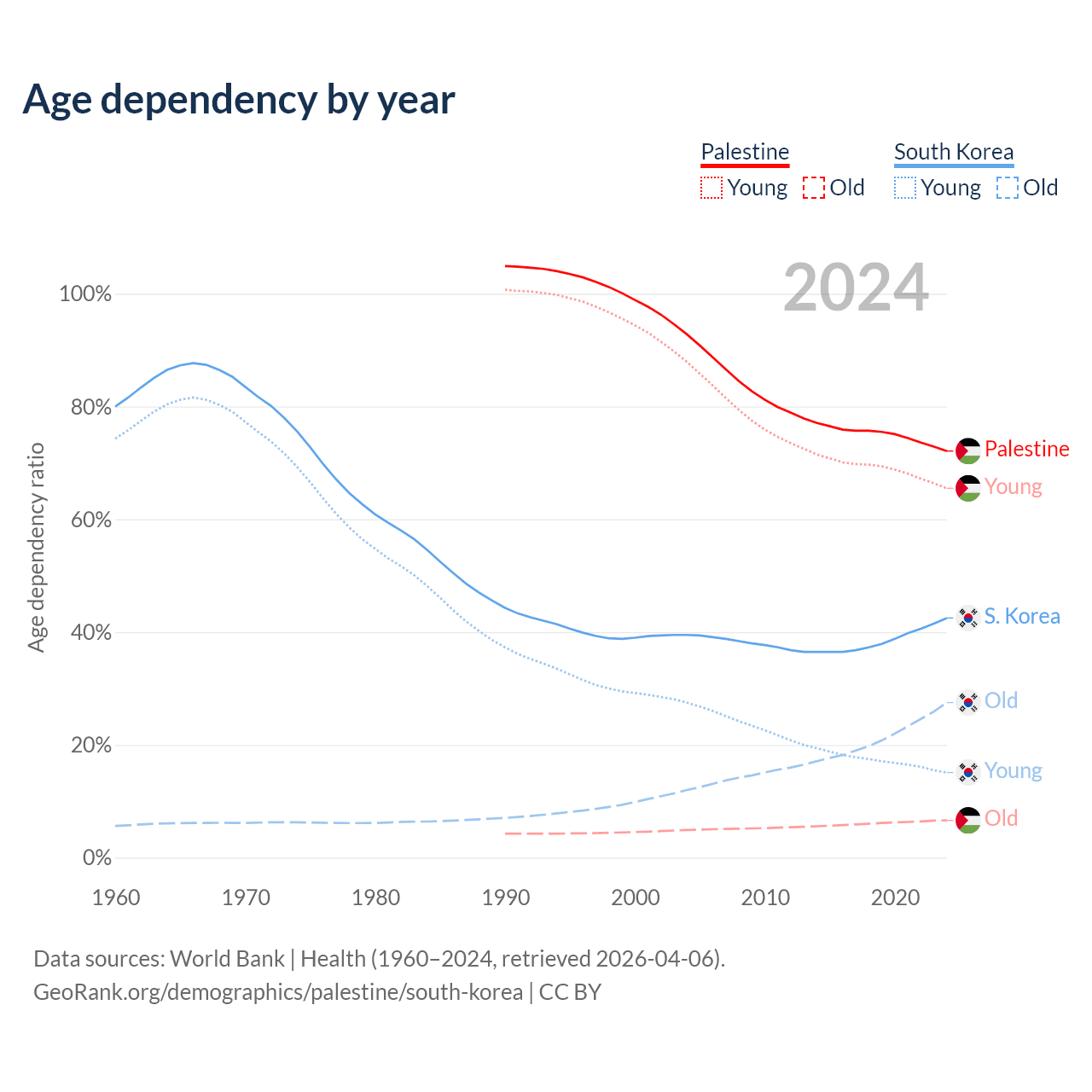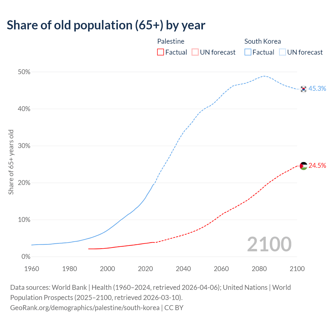 The share of older people aged 65 and over is 3.84% in Palestine and 19.3% in South Korea. Life expectancy in Palestine compared to South Korea .