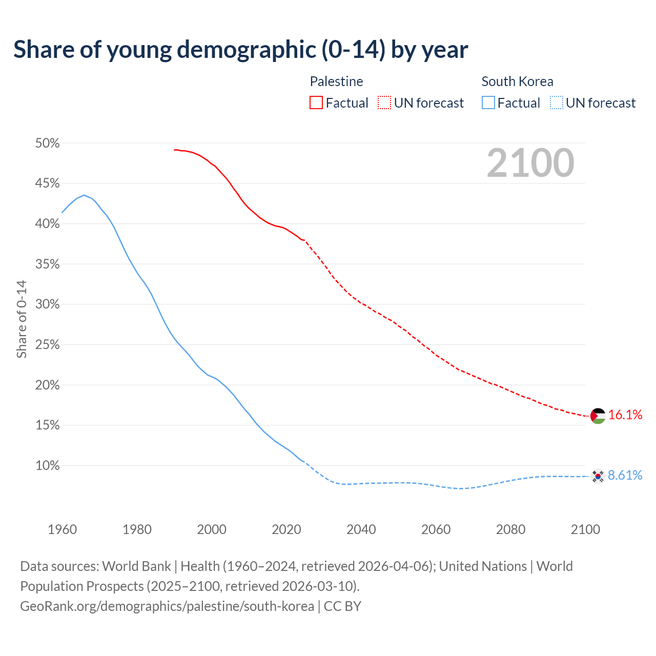 - The share of young demographic (0-15 years old) in Palestine is 38% vs 10.6% in South Korea.