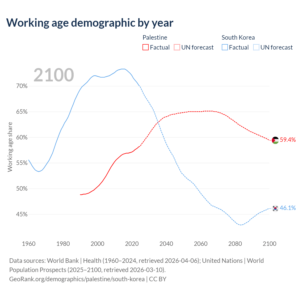 - Palestine has 3.2M working age adults (aged 15-64) vs 36.2M in South Korea.