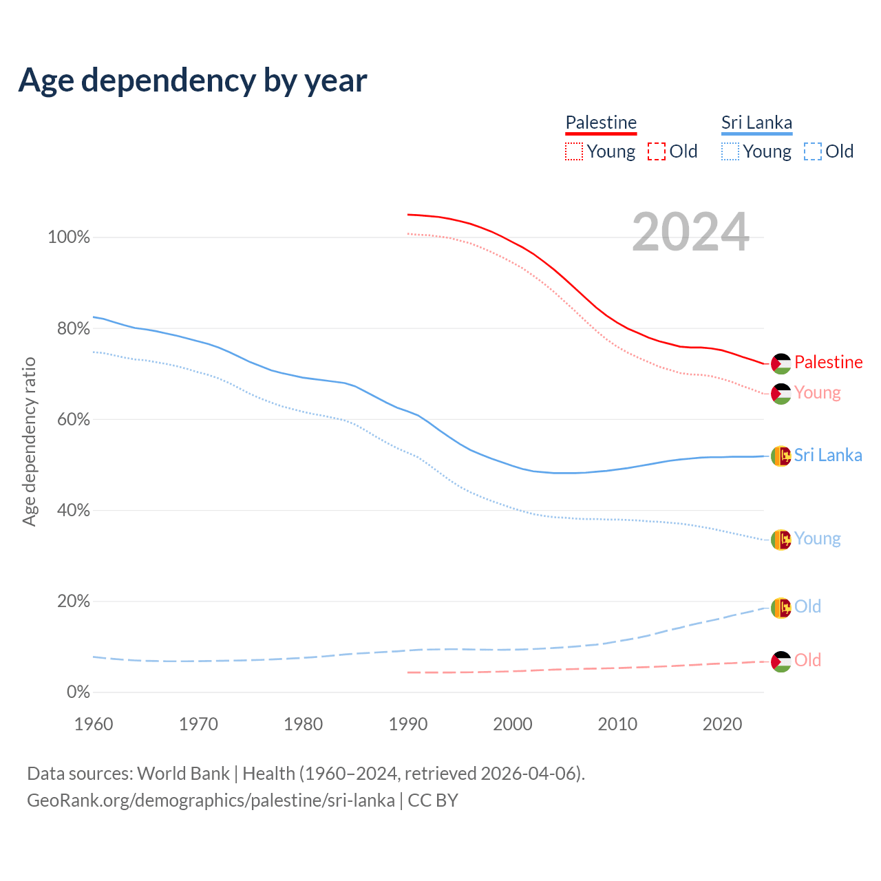 - The share of old-age demographic (65+) in Palestine is 3.84% vs 12.1% in Sri Lanka.