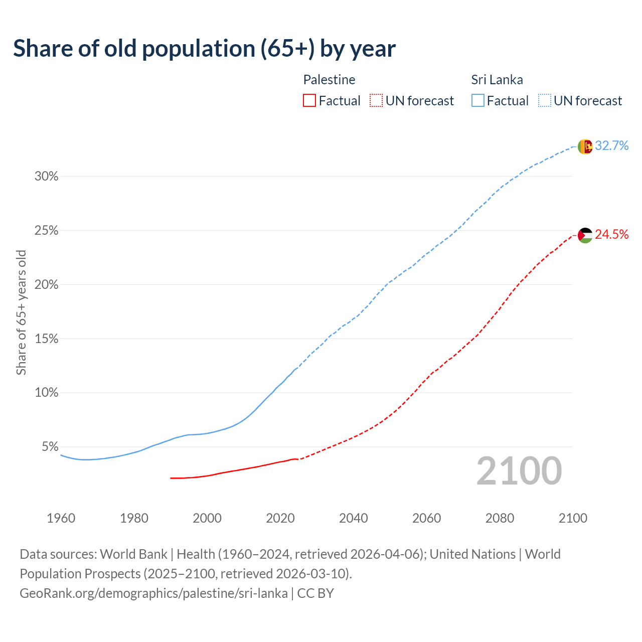 The share of older people aged 65 and over is 3.84% in Palestine and 12.1% in Sri Lanka. Life expectancy in Palestine compared to Sri Lanka .