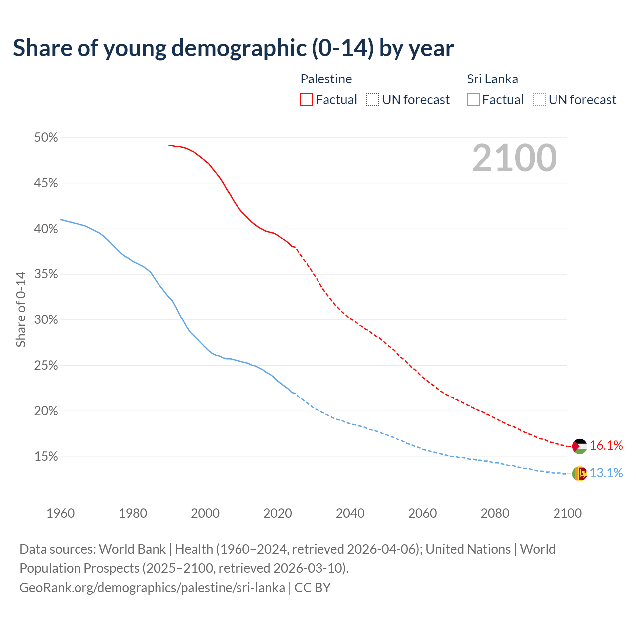 - The share of young demographic (0-15 years old) in Palestine is 38% vs 22% in Sri Lanka.