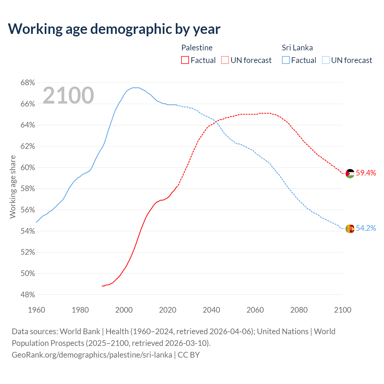- Palestine has 3.2M working age adults (aged 15-64) vs 14.6M in Sri Lanka.