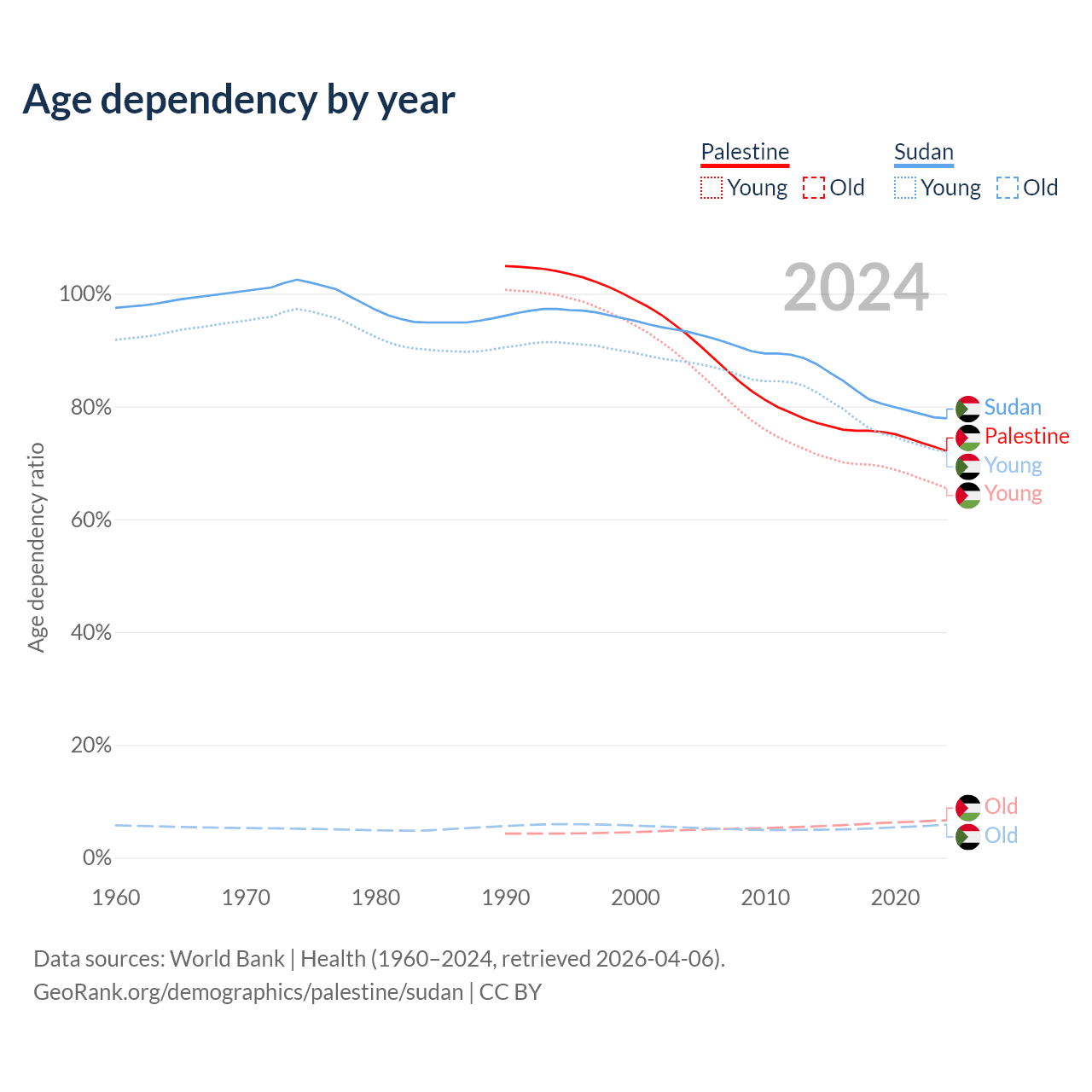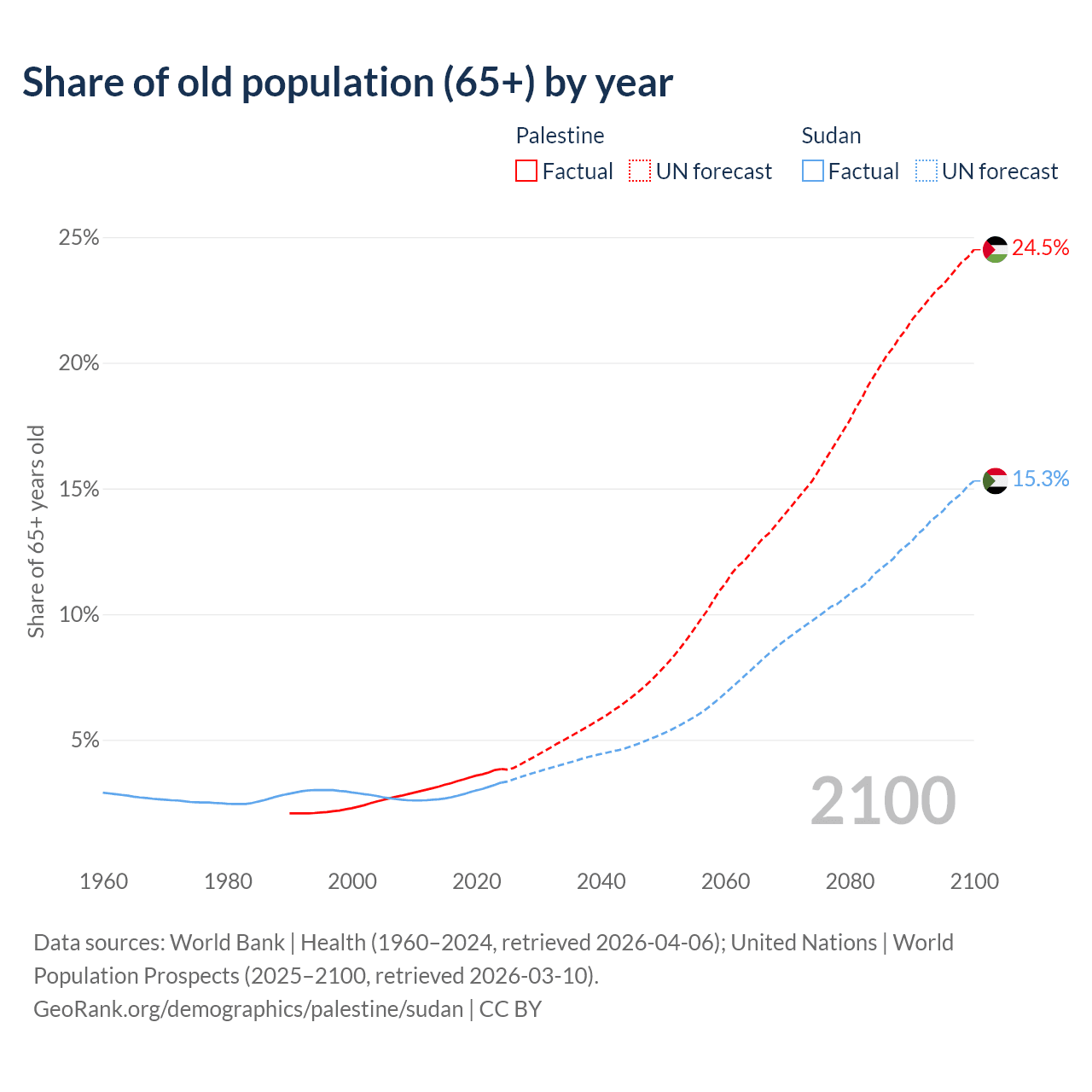 - The share of old-age demographic (65+) in Palestine is 3.84% vs 3.3% in Sudan.