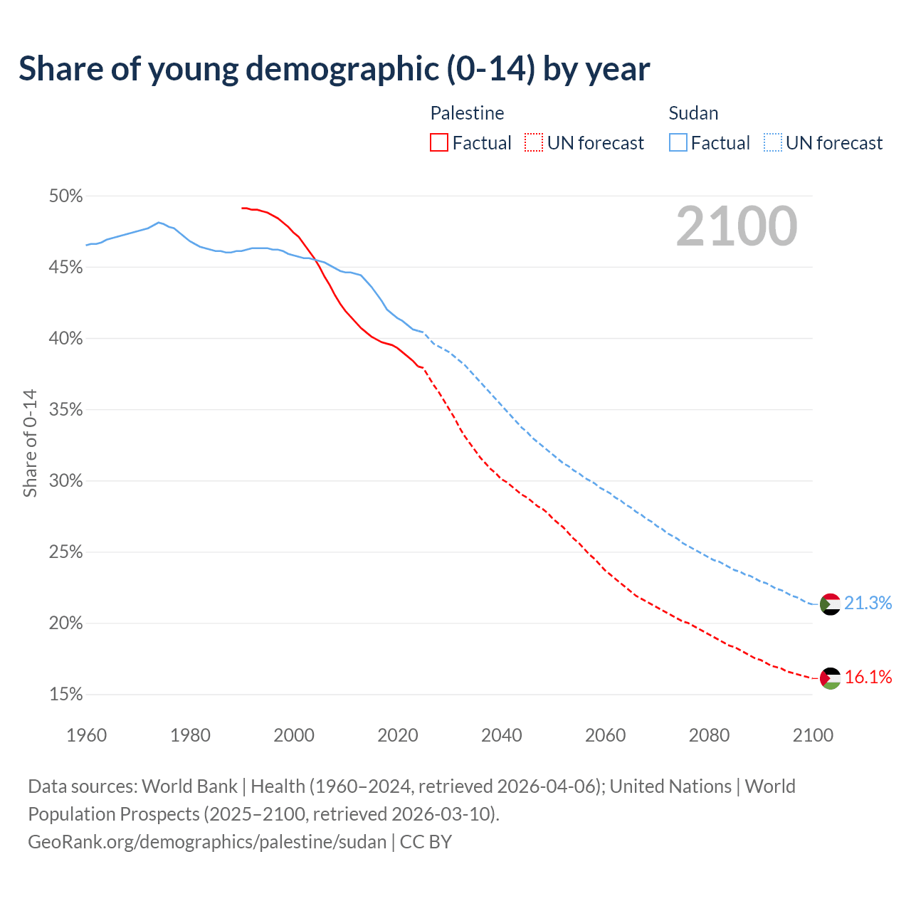 - The share of young demographic (0-15 years old) in Palestine is 38% vs 40.5% in Sudan.