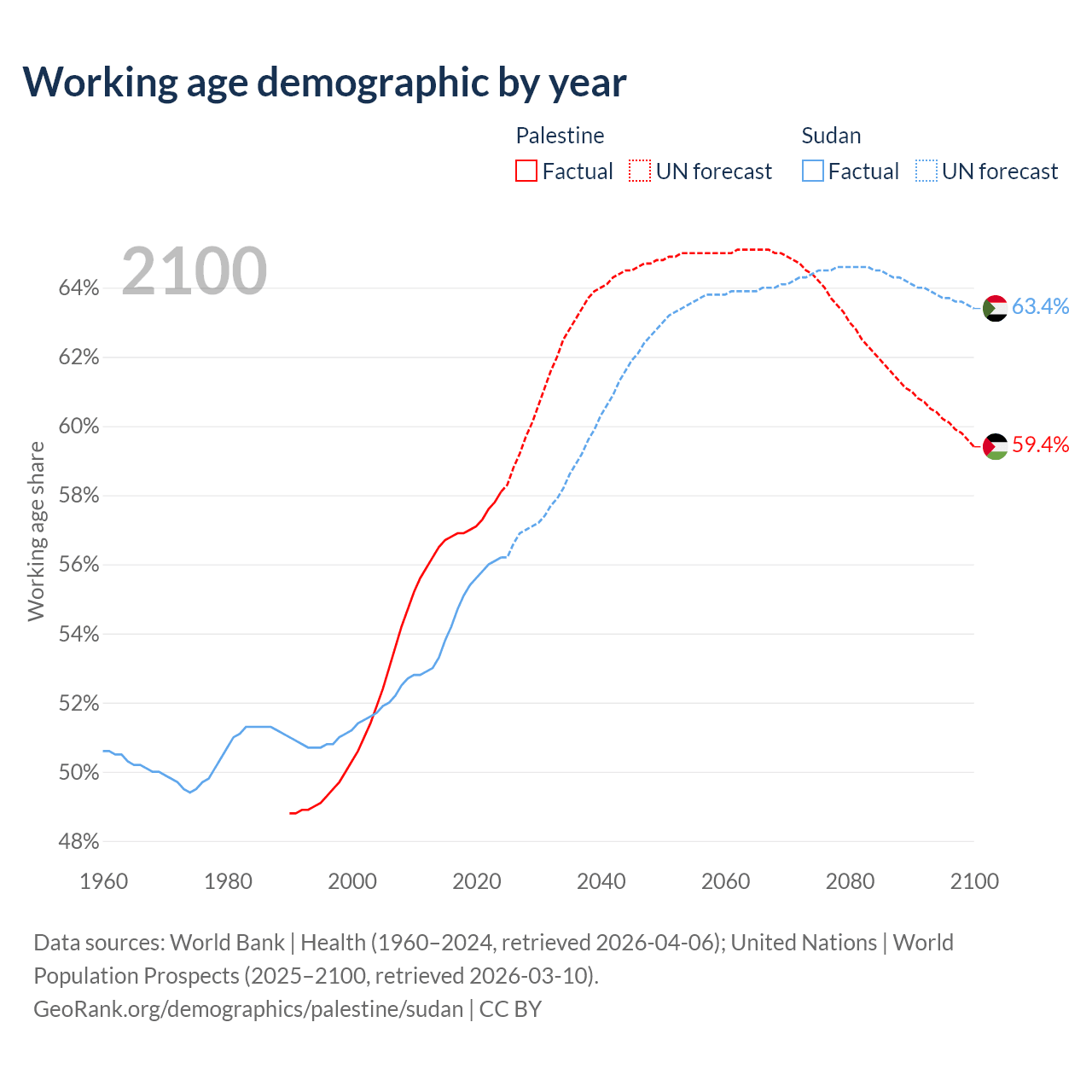 Median age Palestine vs Sudan, 1960-2100