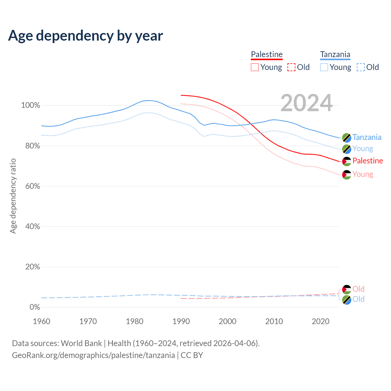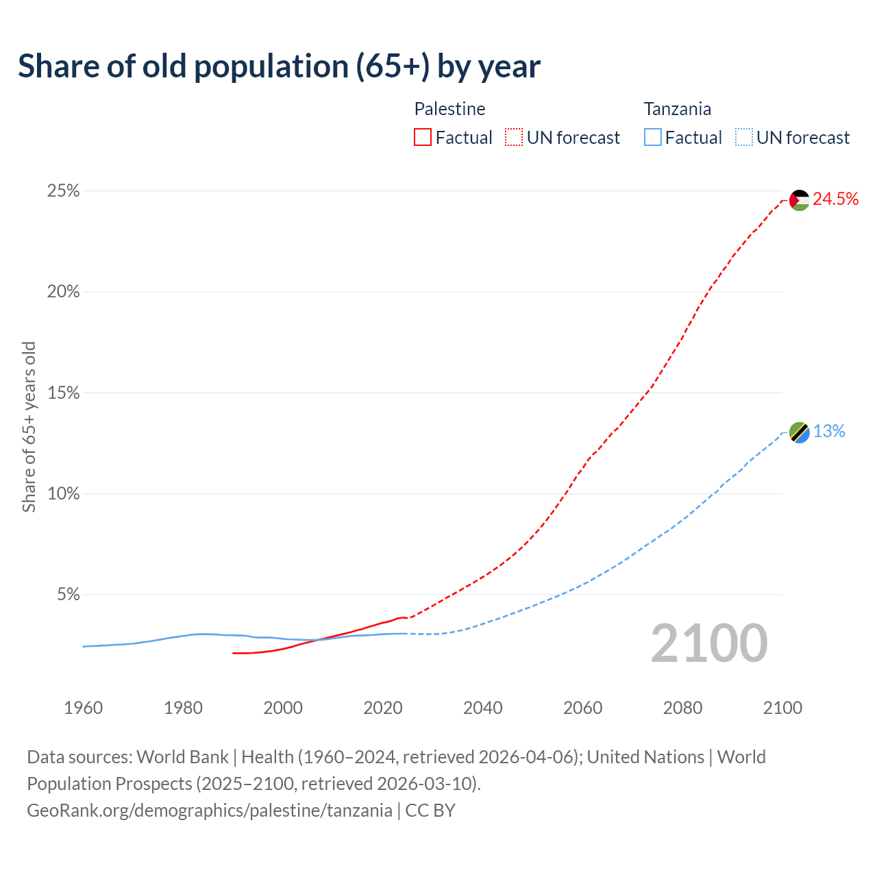 - The share of old-age demographic (65+) in Palestine is 3.84% vs 3.05% in Tanzania.