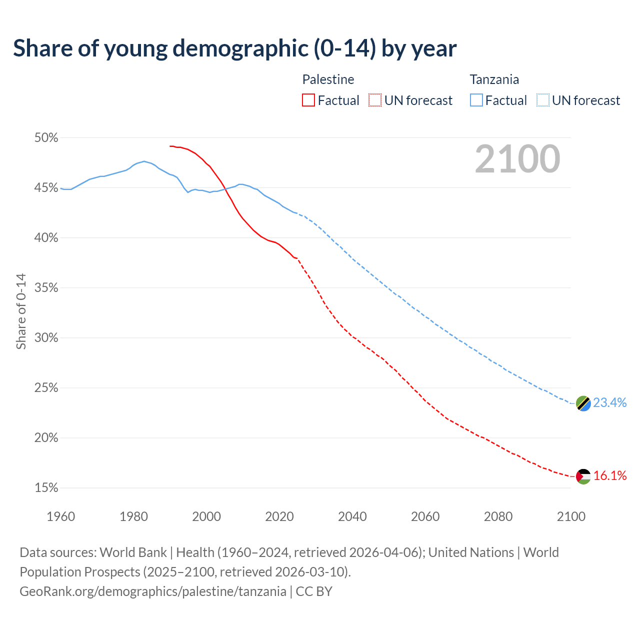 - The share of young demographic (0-15 years old) in Palestine is 38% vs 42.5% in Tanzania.