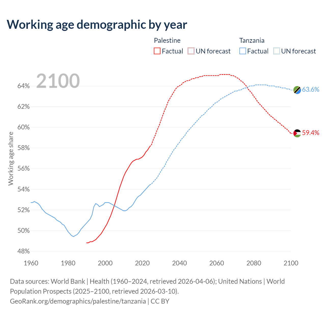 Median age Palestine vs Tanzania, 1960-2100