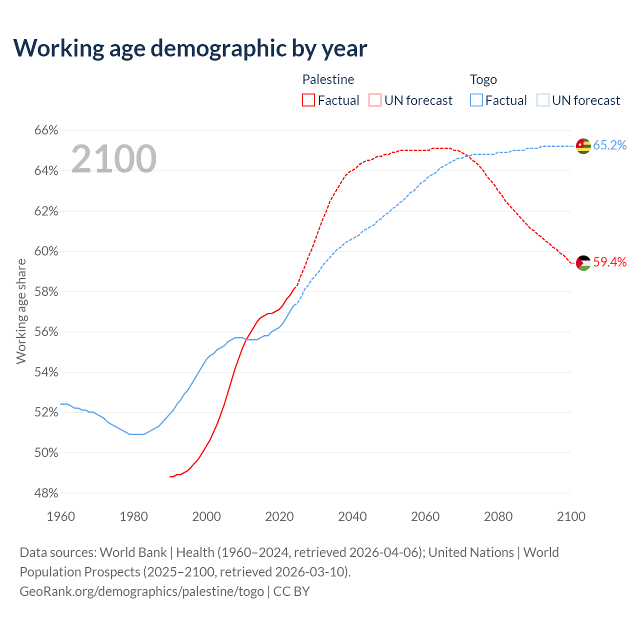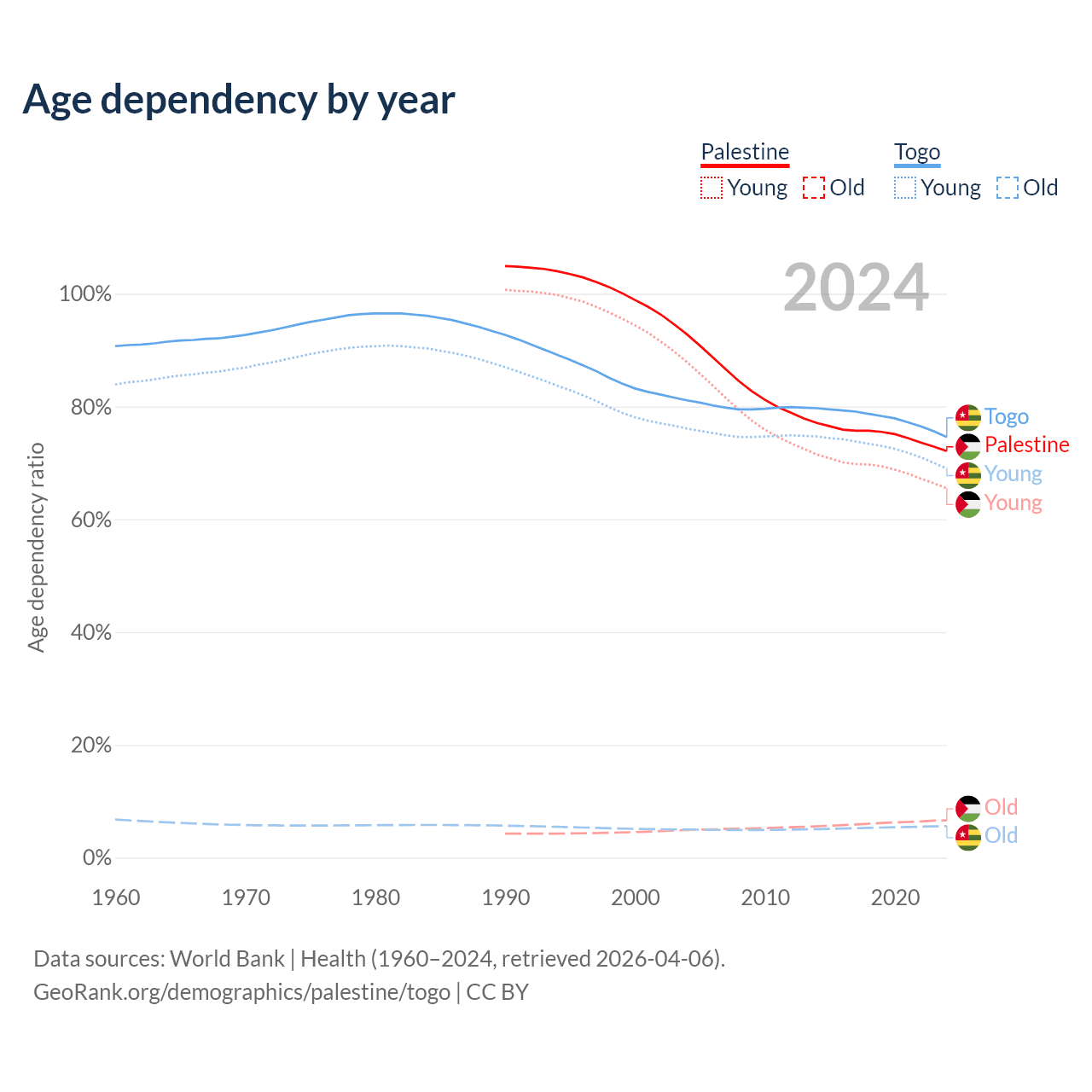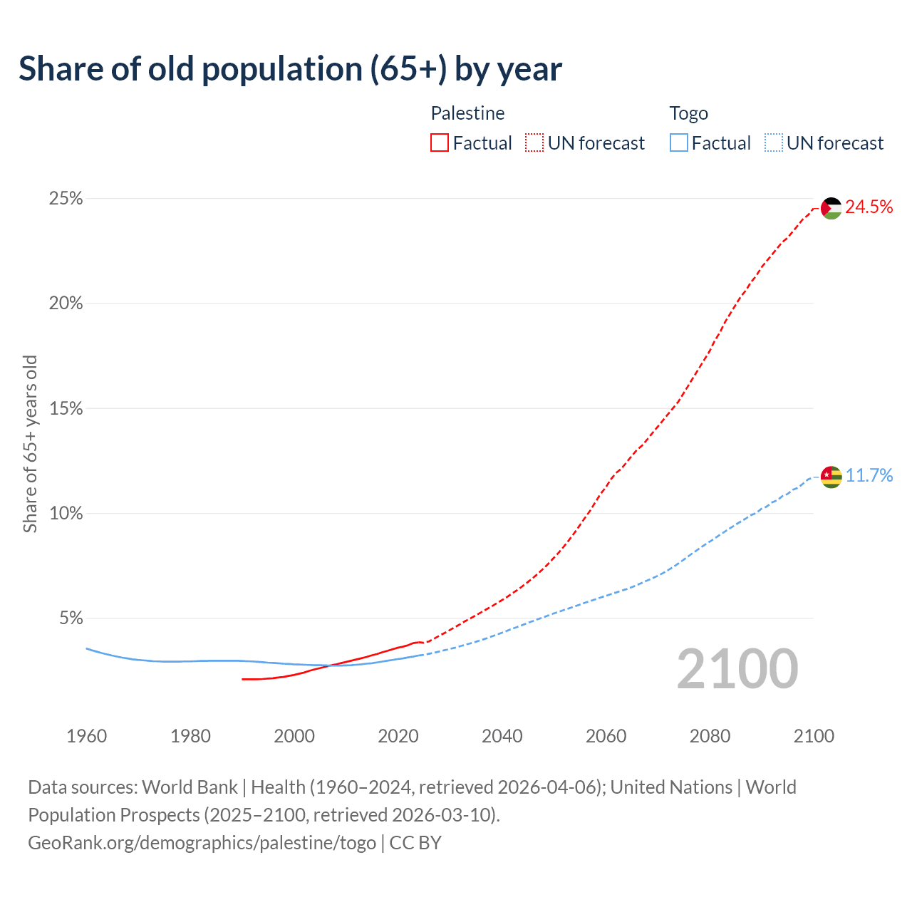 - The share of old-age demographic (65+) in Palestine is 3.84% vs 3.21% in Togo.