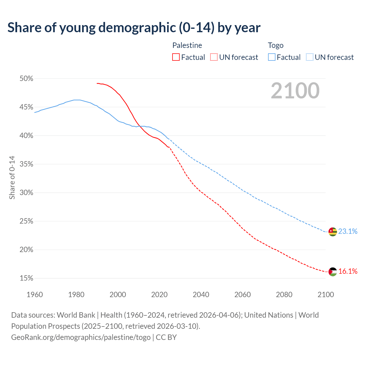 - The share of young demographic (0-15 years old) in Palestine is 38% vs 39.5% in Togo.