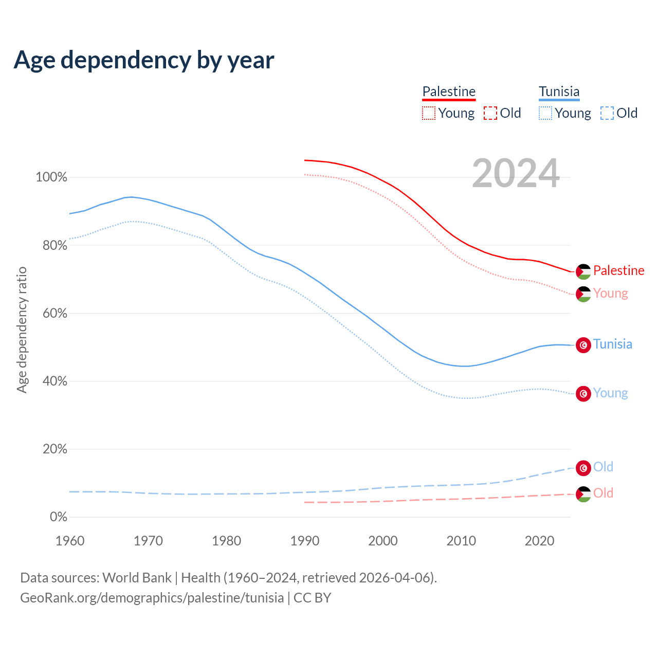 - The share of old-age demographic (65+) in Palestine is 3.84% vs 9.53% in Tunisia.