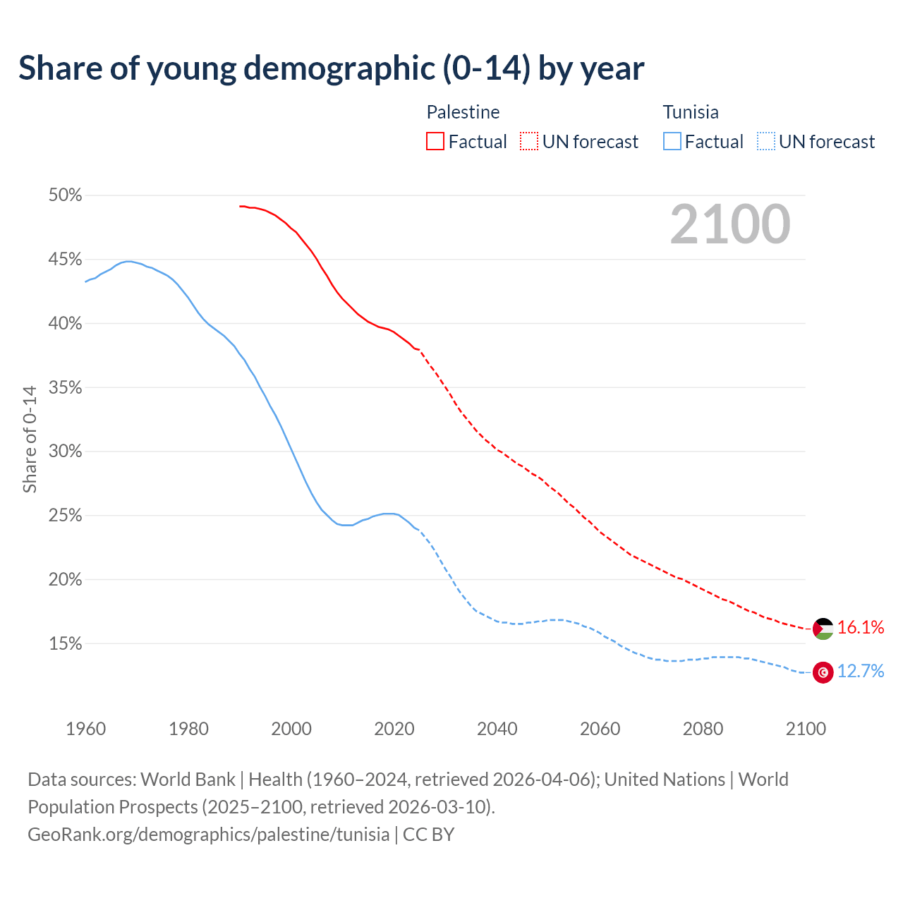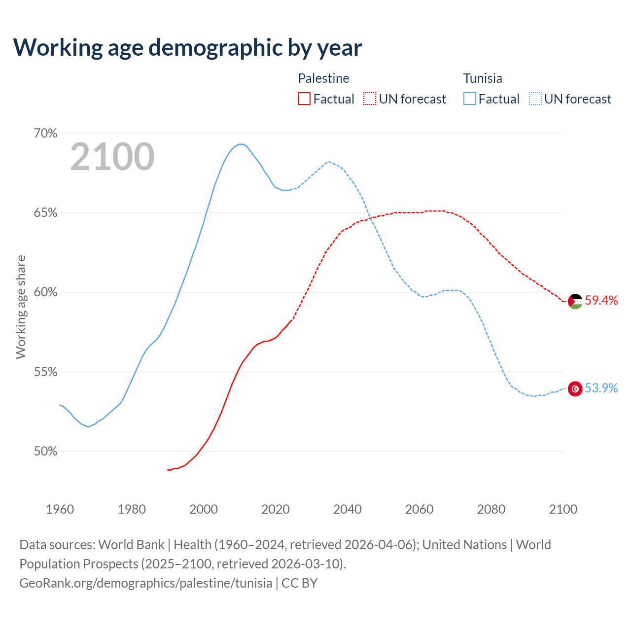 Median age Palestine vs Tunisia, 1960-2100