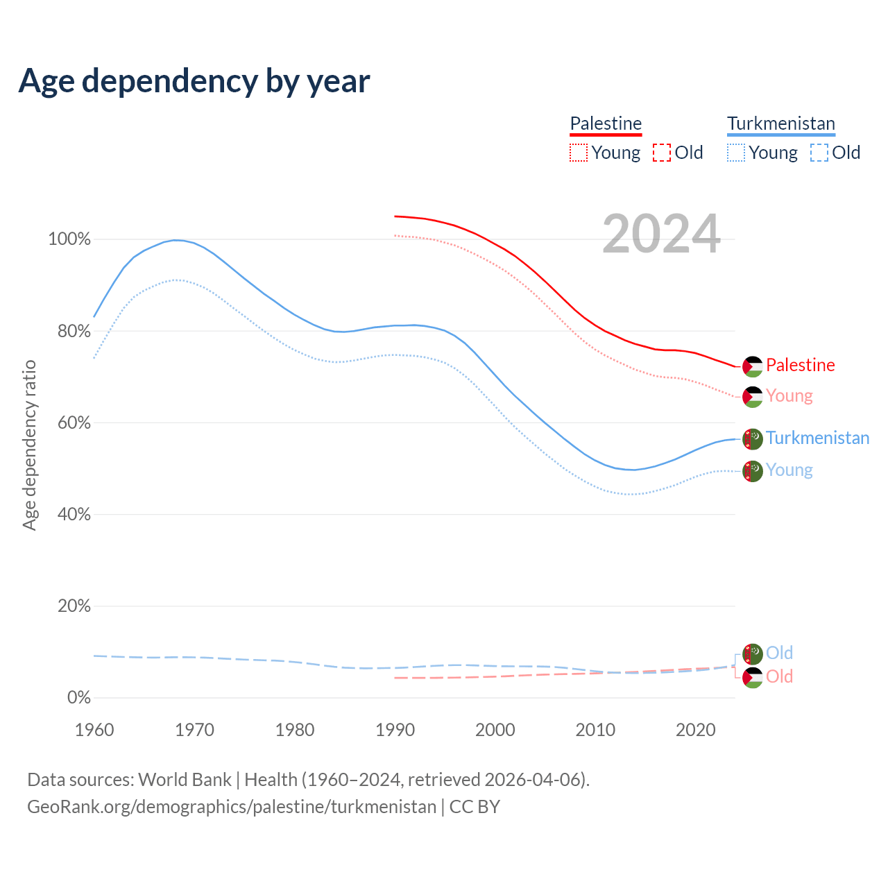 - The share of old-age demographic (65+) in Palestine is 3.84% vs 4.53% in Turkmenistan.