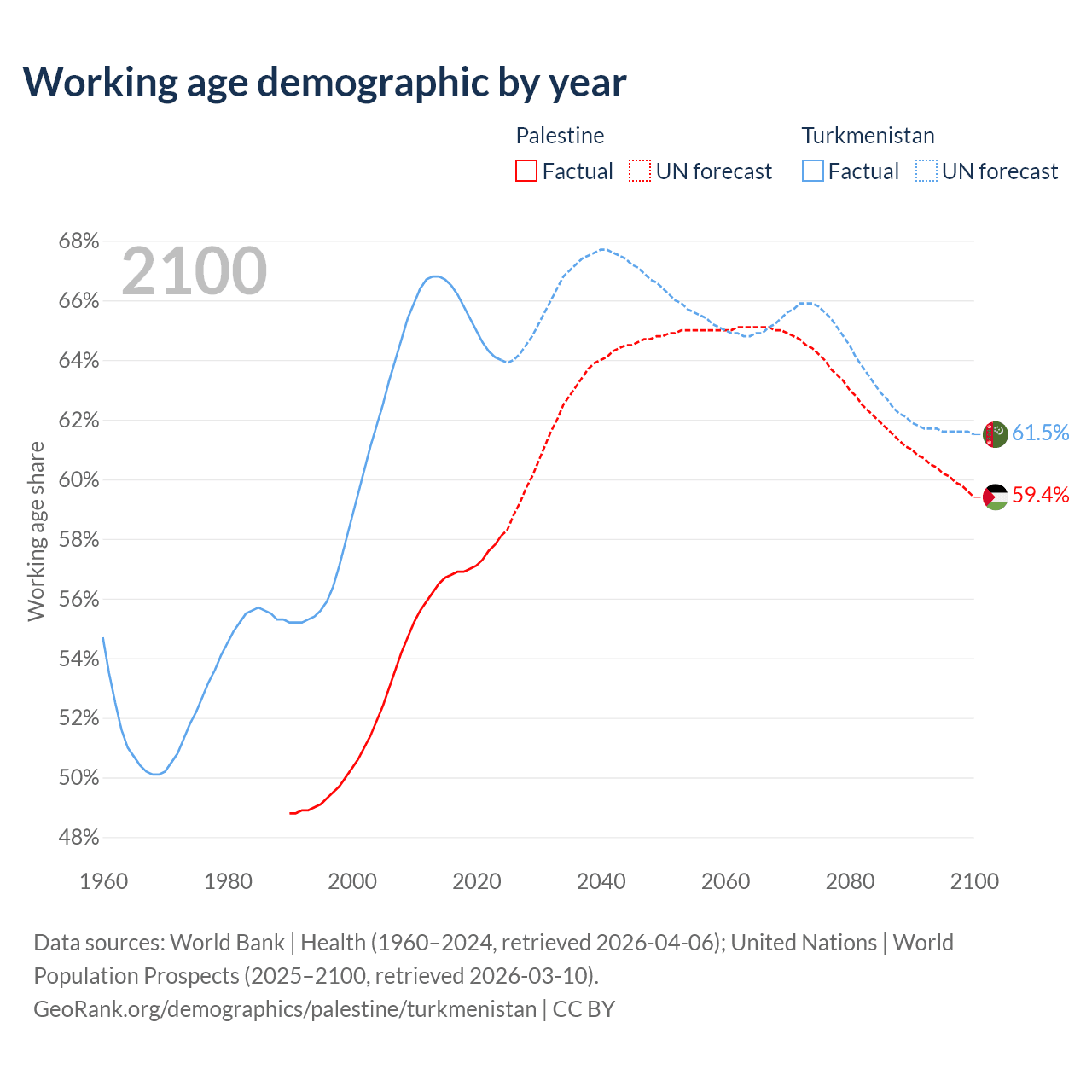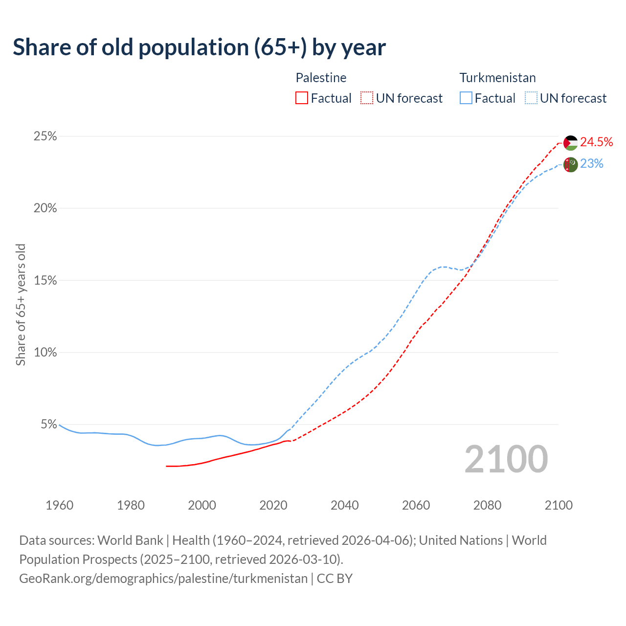 The share of older people aged 65 and over is 3.84% in Palestine and 4.53% in Turkmenistan. Life expectancy in Palestine compared to Turkmenistan .