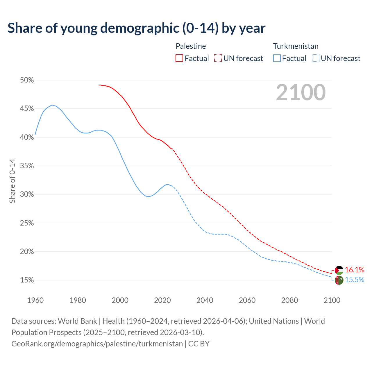 - The share of young demographic (0-15 years old) in Palestine is 38% vs 31.5% in Turkmenistan.