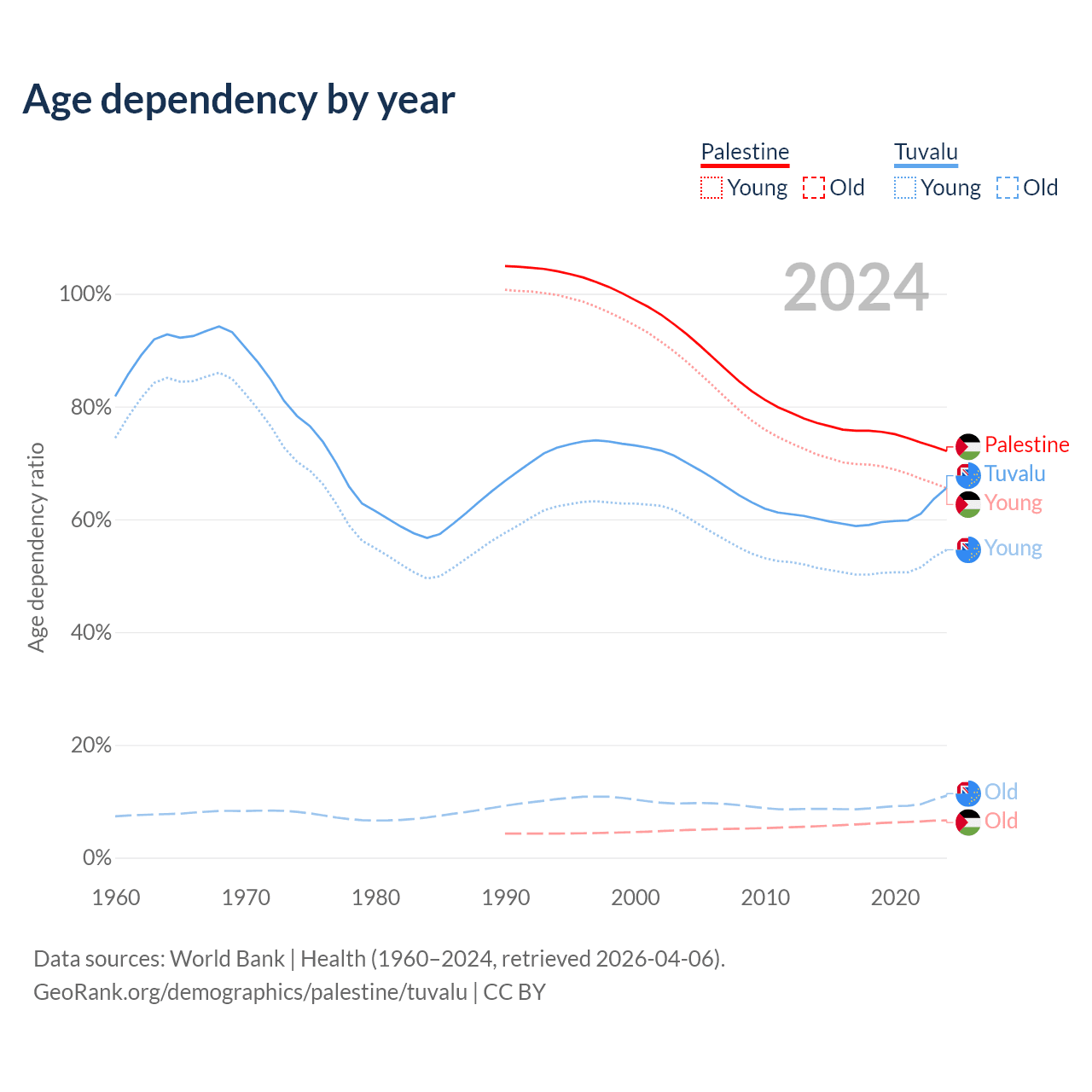 - The share of old-age demographic (65+) in Palestine is 3.84% vs 6.67% in Tuvalu.