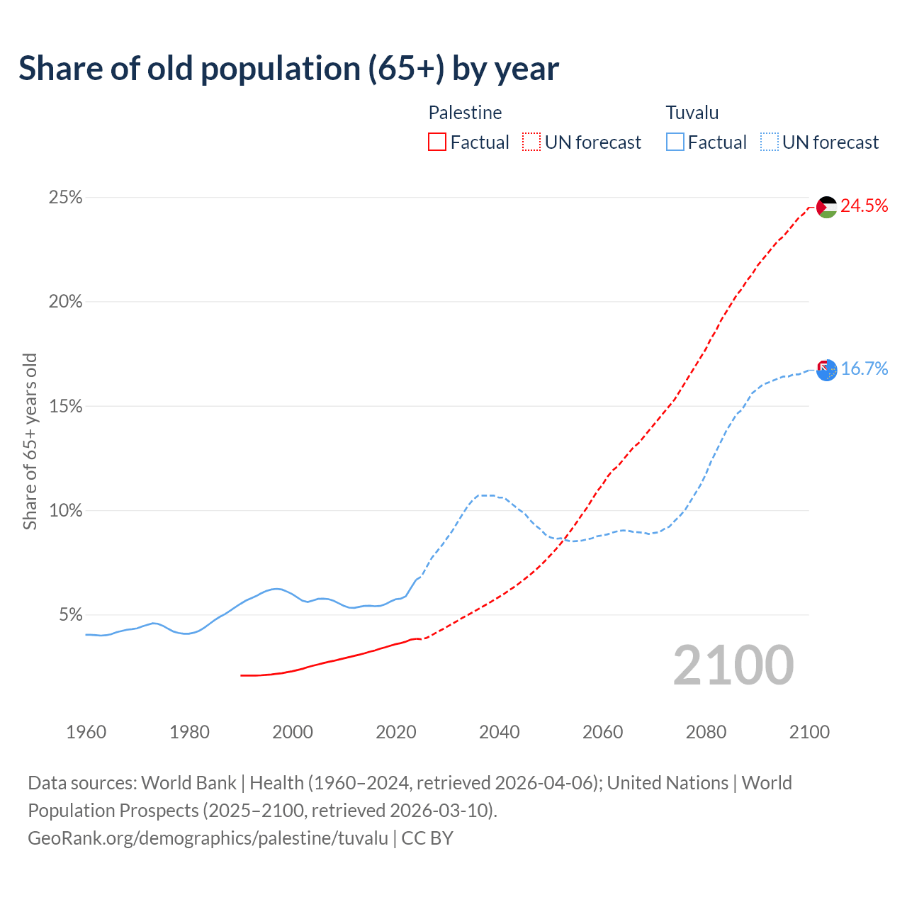 The share of older people aged 65 and over is 3.84% in Palestine and 6.67% in Tuvalu. Life expectancy in Palestine compared to Tuvalu .