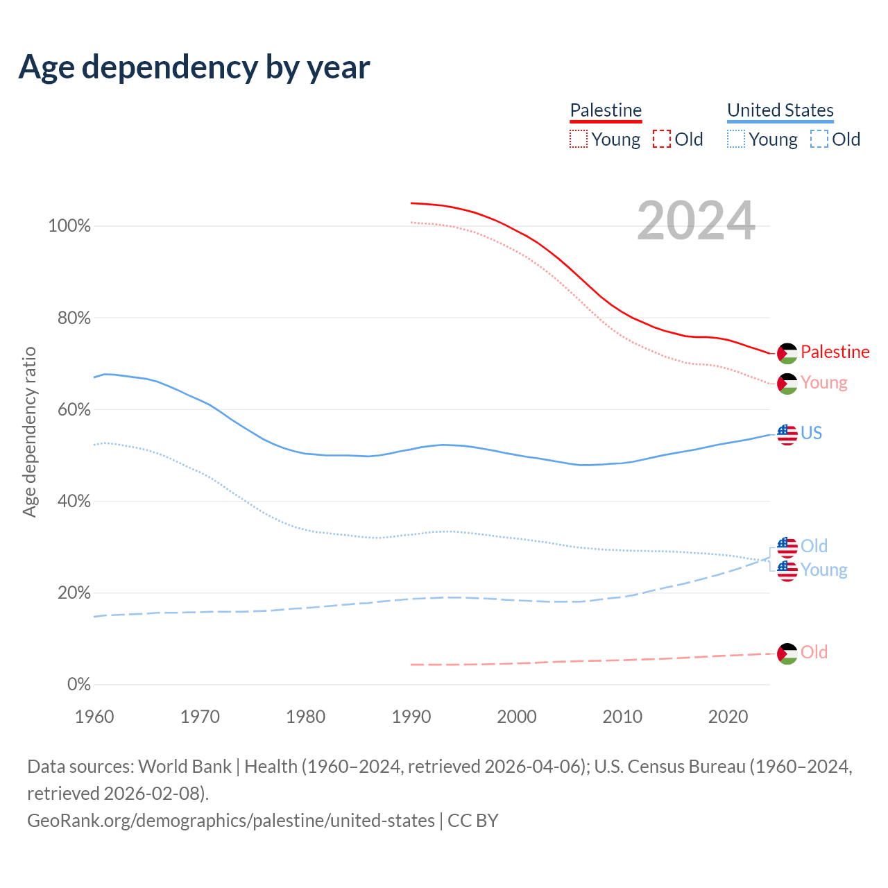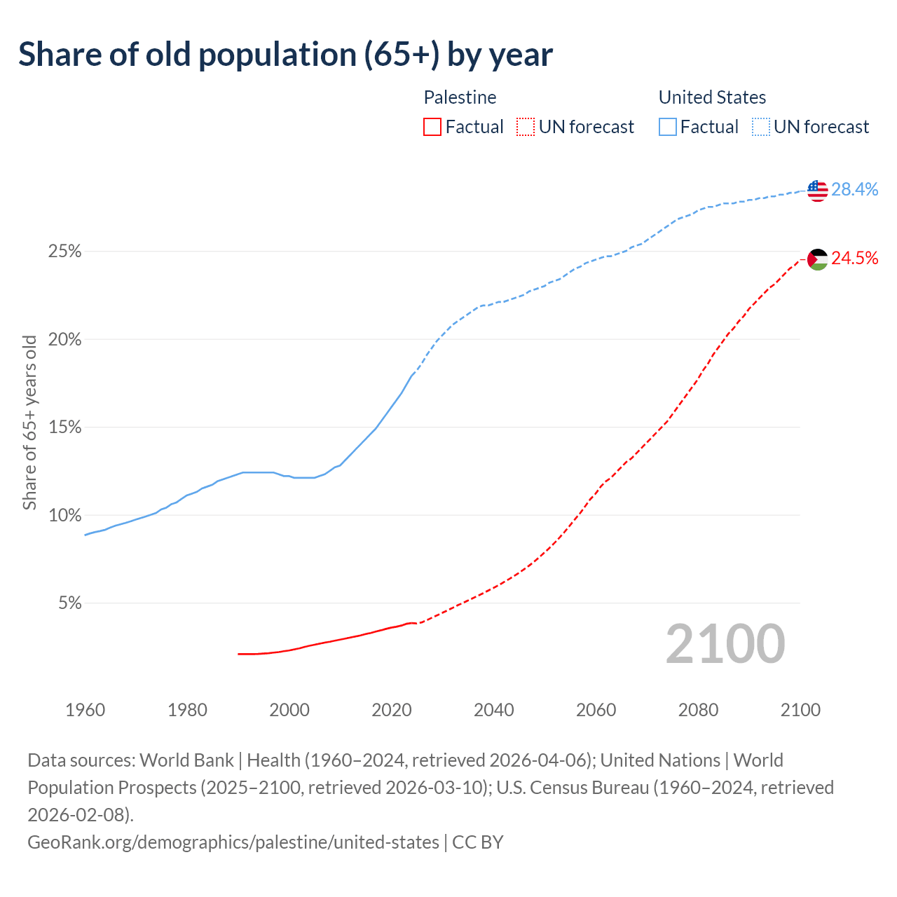 - The share of old-age demographic (65+) in Palestine is 3.84% vs 17.9% in the United States.