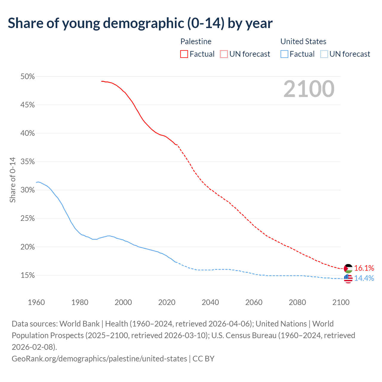 - The share of young demographic (0-15 years old) in Palestine is 38% vs 17.3% in the United States.