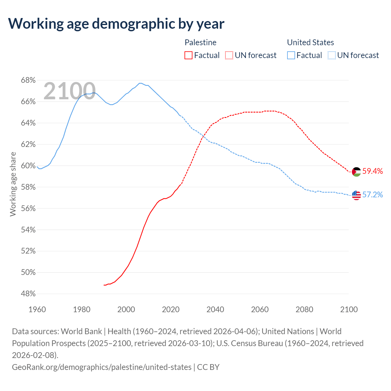 - Palestine has 3.2M working age adults (aged 15-64) vs 223M in the United States.