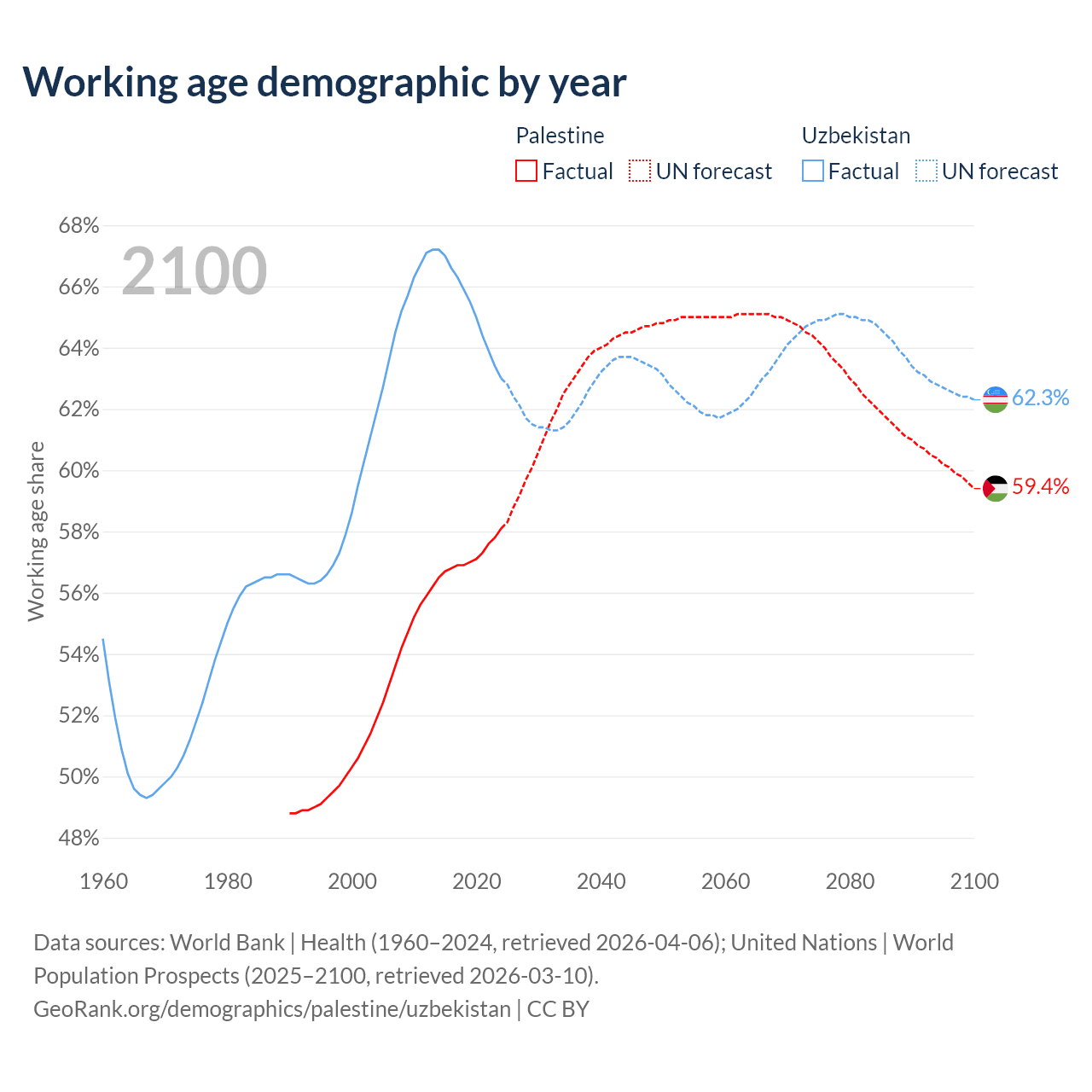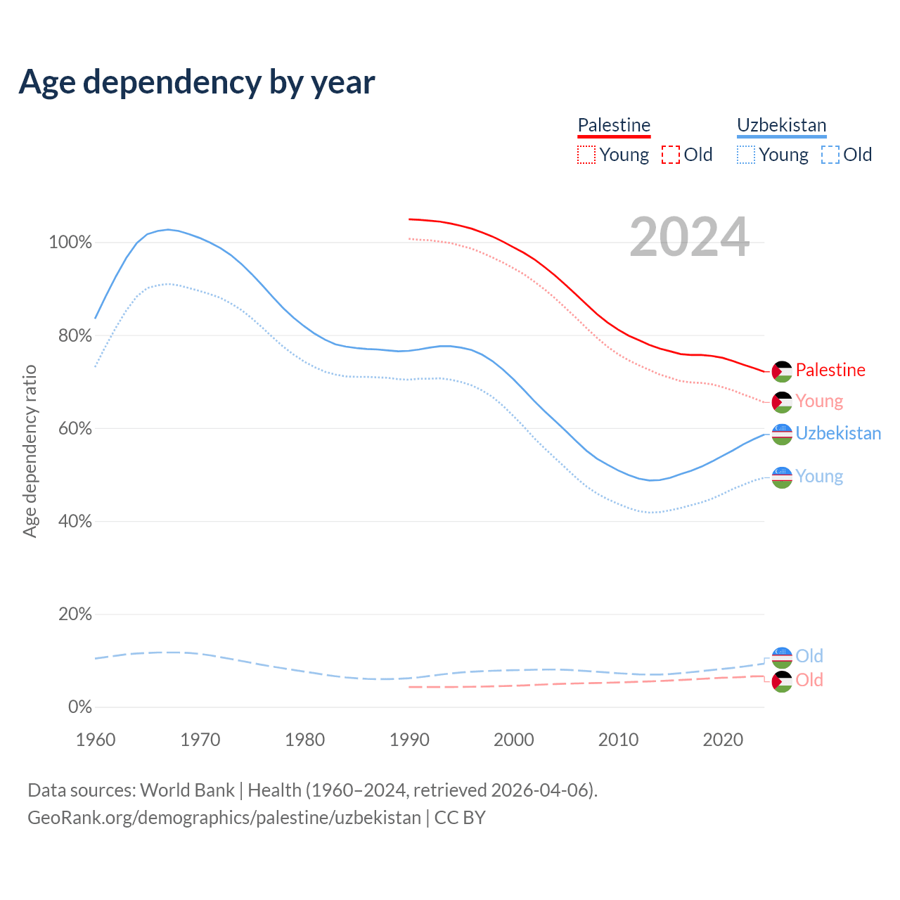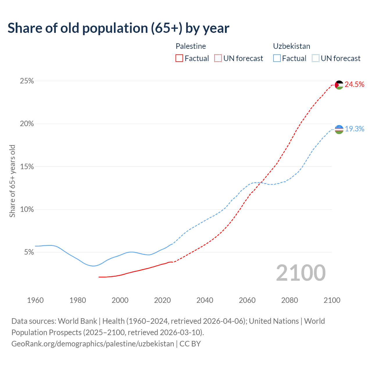 - The share of old-age demographic (65+) in Palestine is 3.84% vs 5.86% in Uzbekistan.