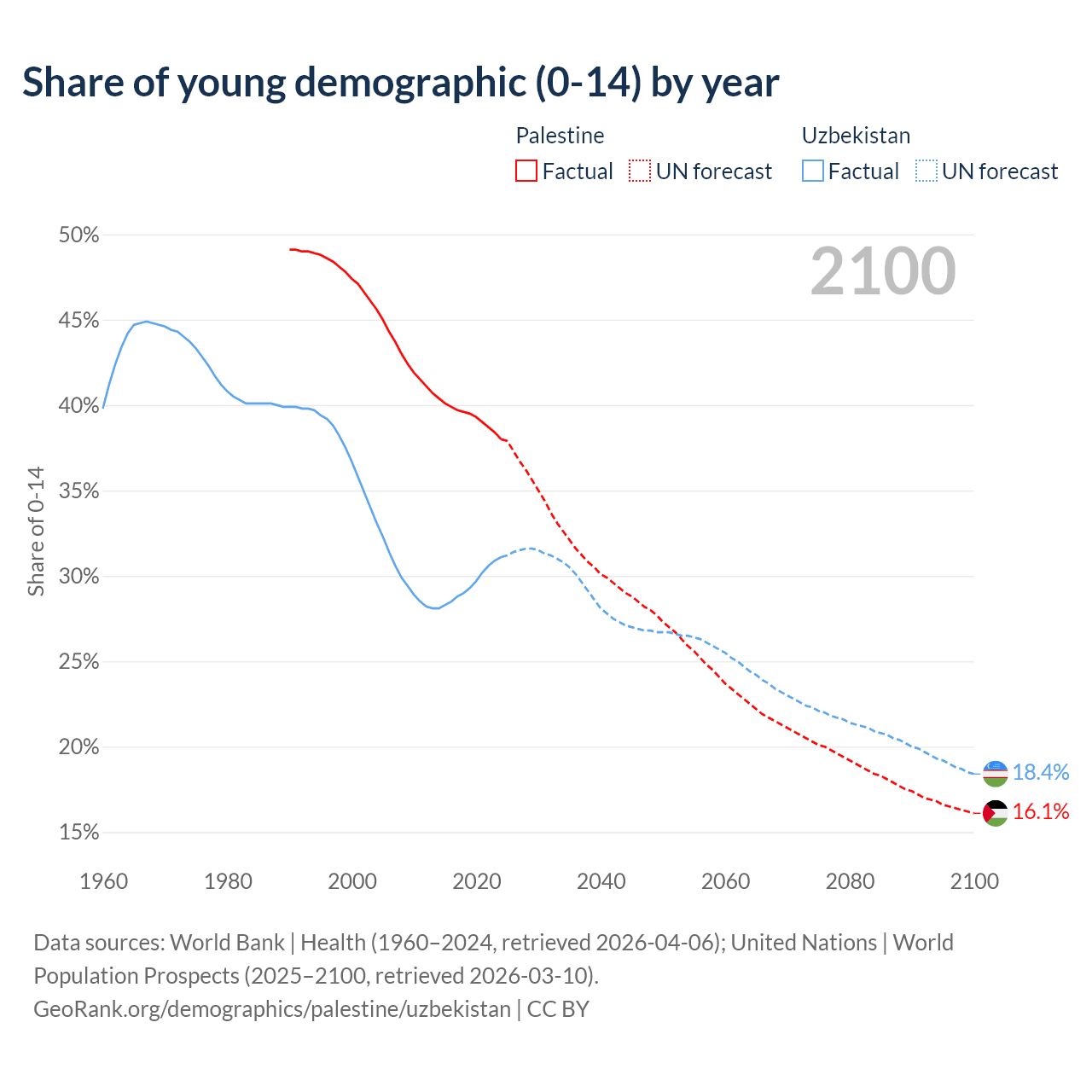 - As of 2026, the population of Palestine is 5.5M vs 37.9M in Uzbekistan - 6.9 times difference.