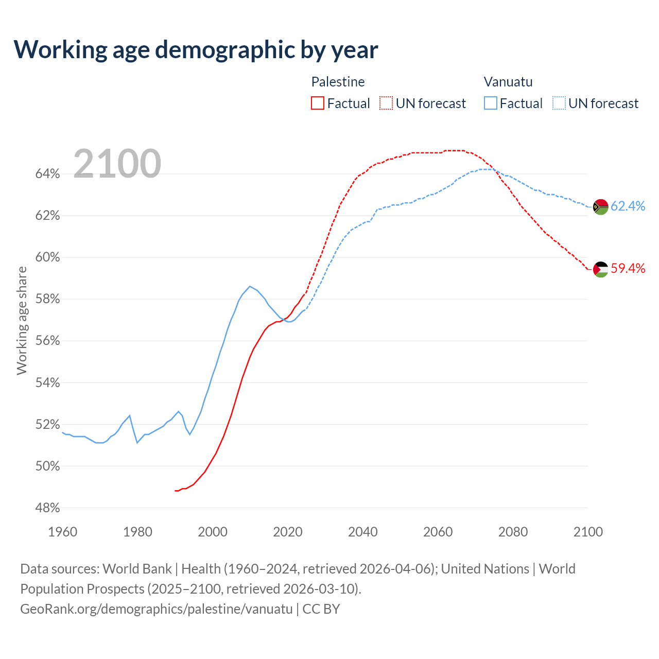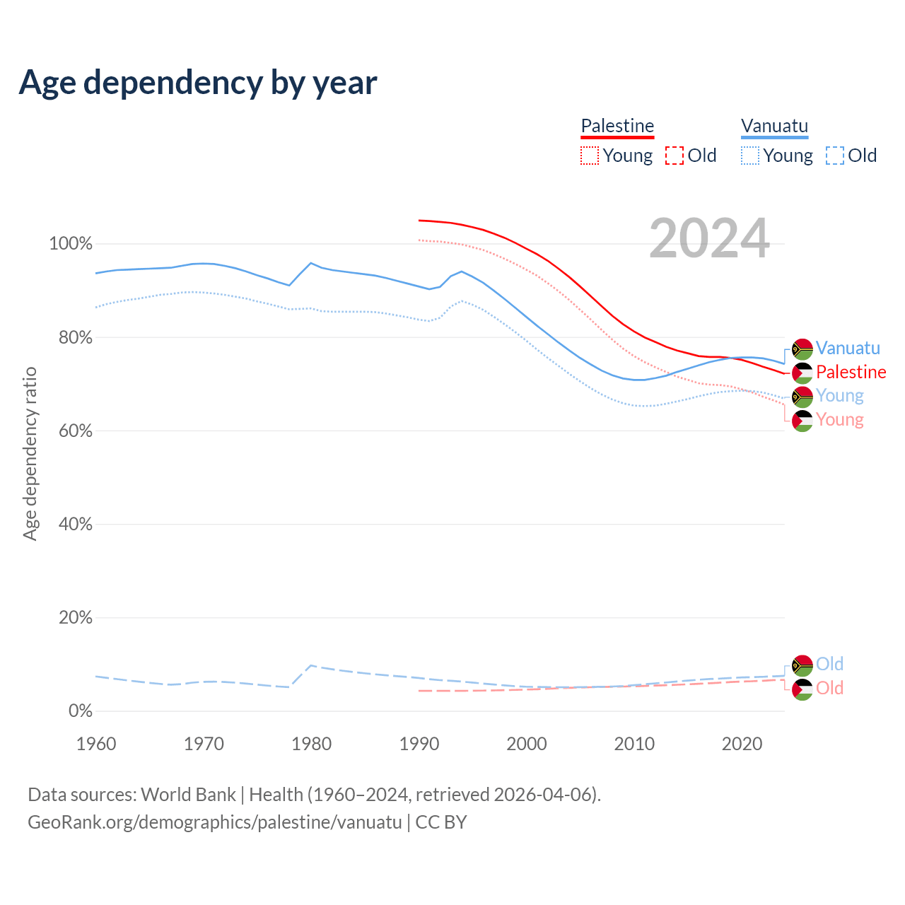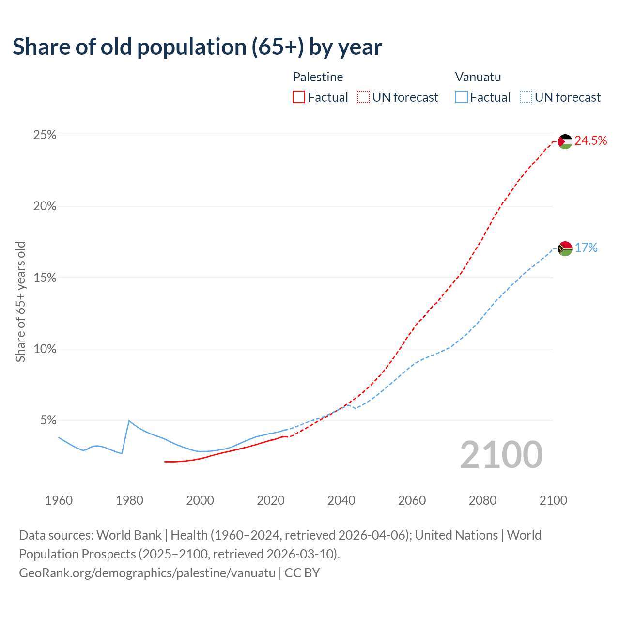 - The share of old-age demographic (65+) in Palestine is 3.84% vs 4.3% in Vanuatu.