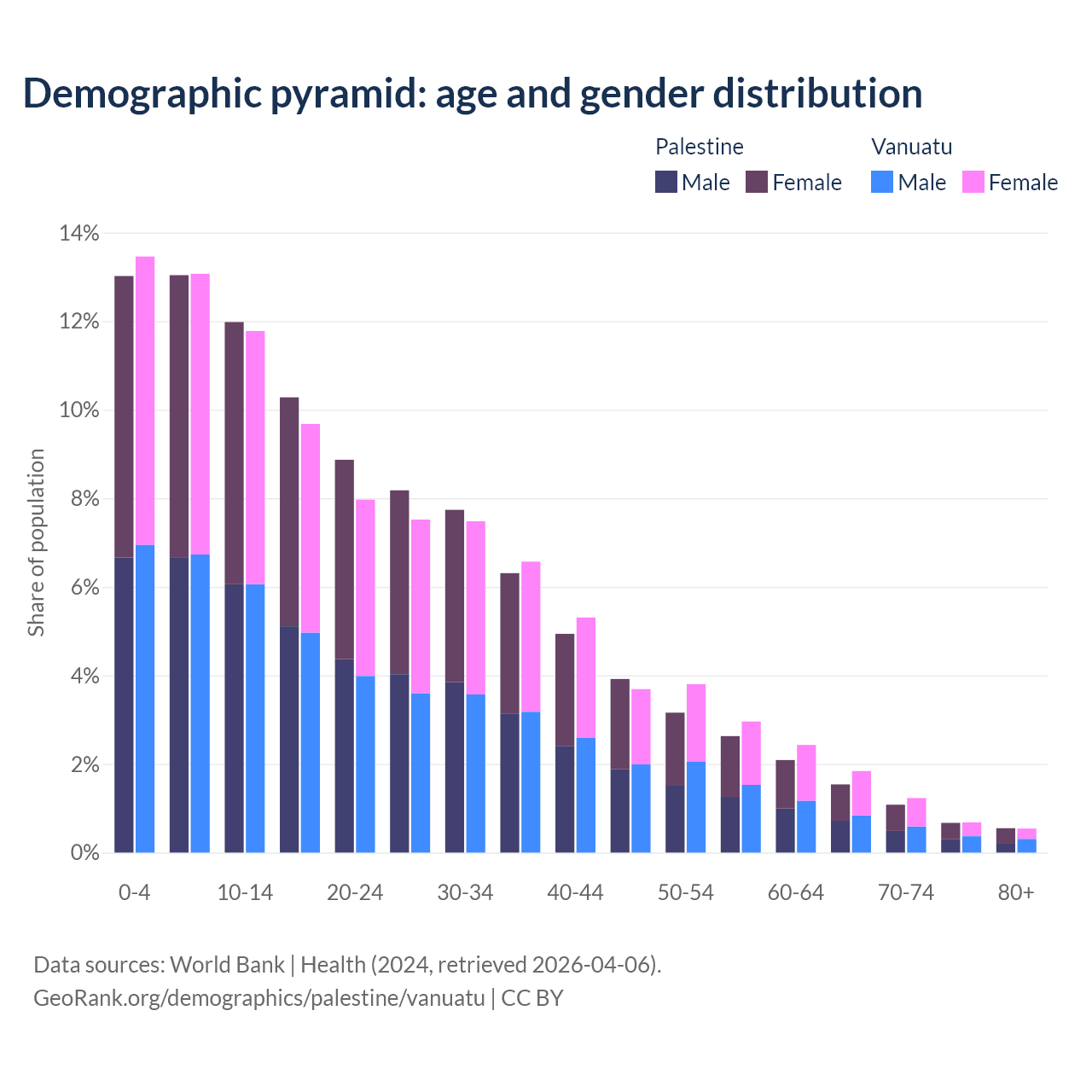 - Palestine is ranked 157/196 by median age (oldest to youngest) vs 156/196 for Vanuatu.