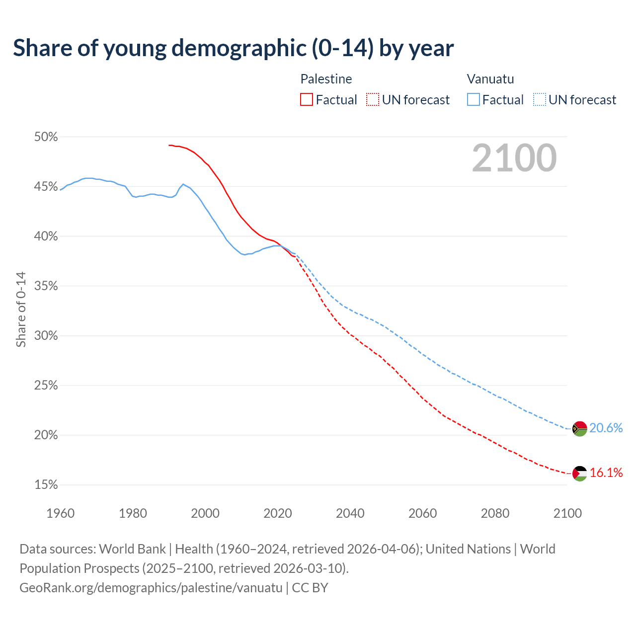 - The share of young demographic (0-15 years old) in Palestine is 38% vs 38.3% in Vanuatu.