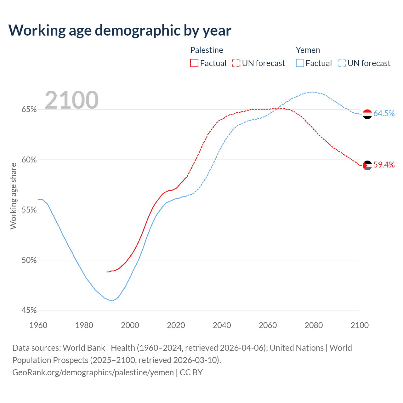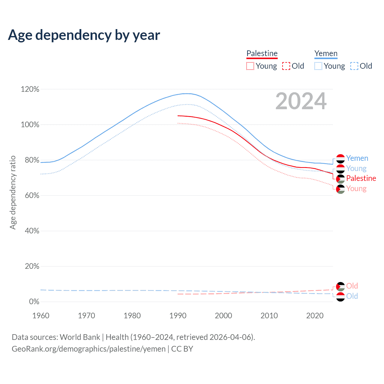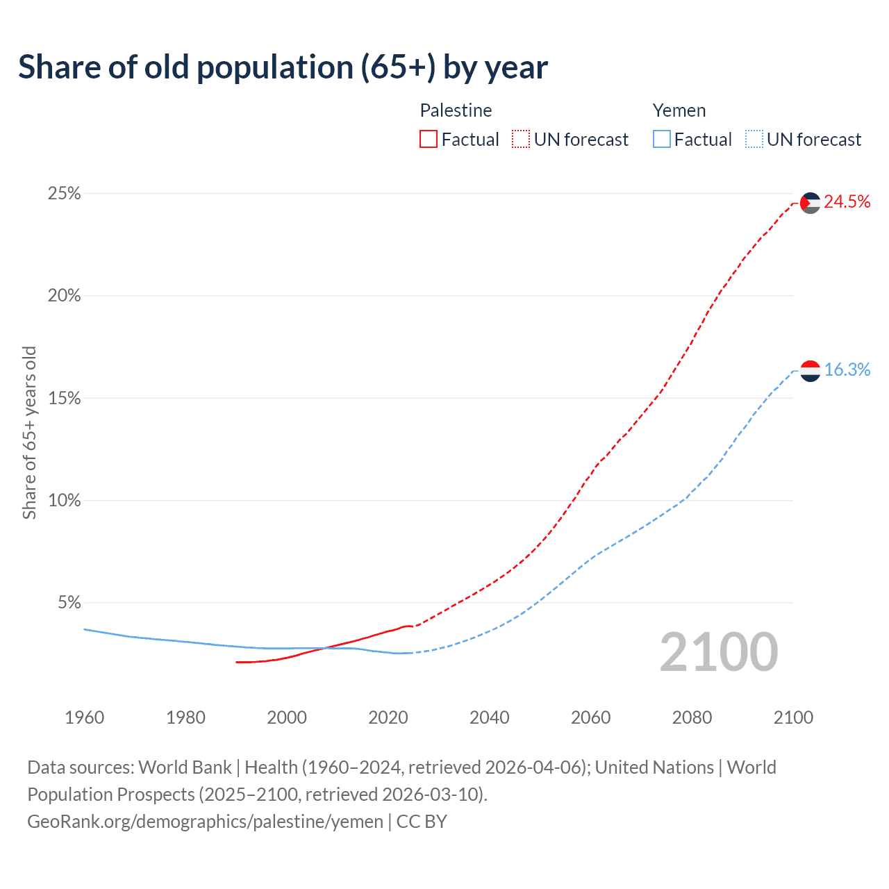 - The share of old-age demographic (65+) in Palestine is 3.84% vs 2.52% in Yemen.