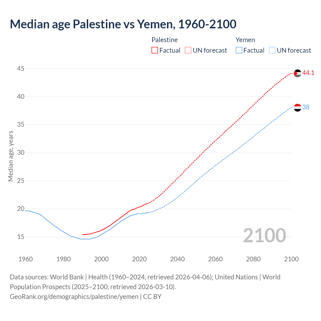 Median age Palestine vs Yemen, 1960-2100