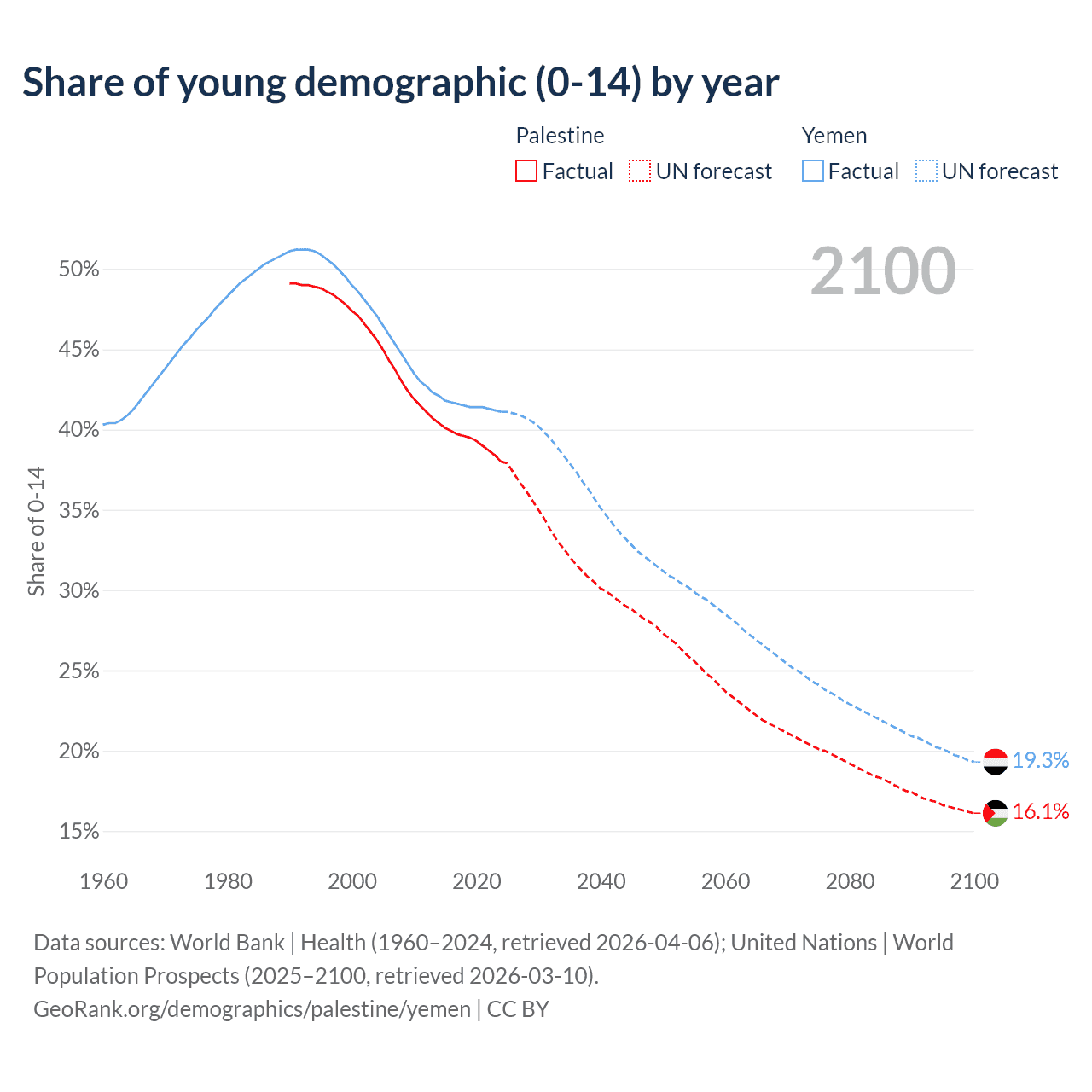 - The share of young demographic (0-15 years old) in Palestine is 38% vs 41.1% in Yemen.