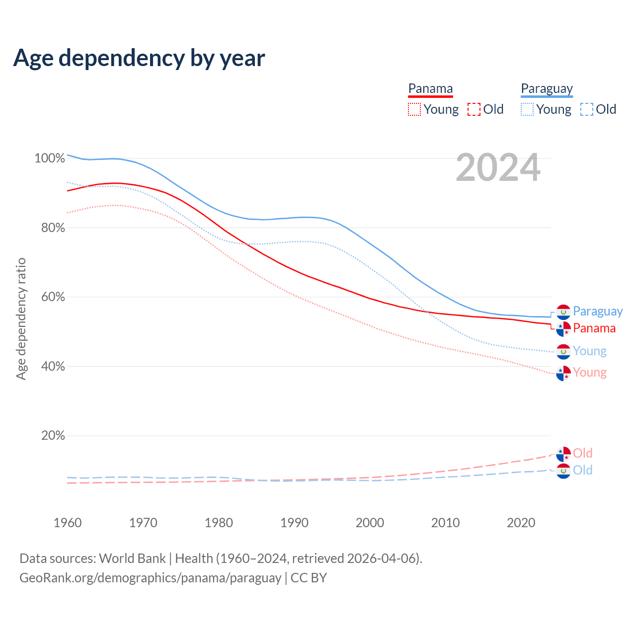 - Panama is ranked 94/196 by median age (oldest to youngest) vs 118/196 for Paraguay.
