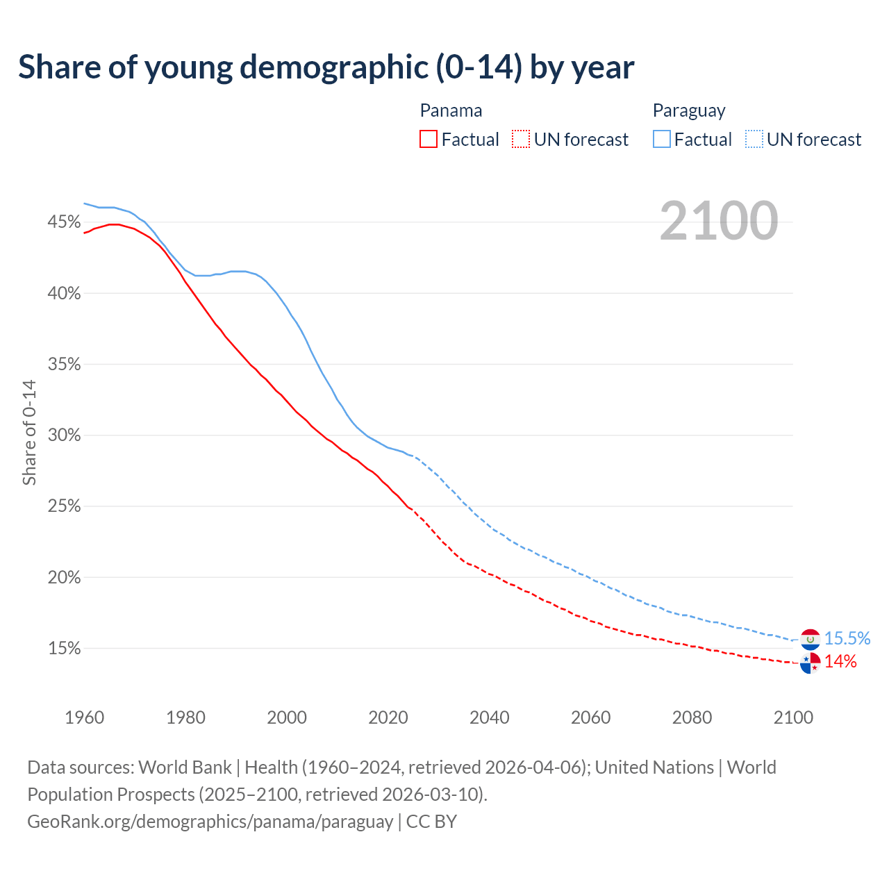 - The share of young demographic (0-15 years old) in Panama is 24.9% vs 28.6% in Paraguay.