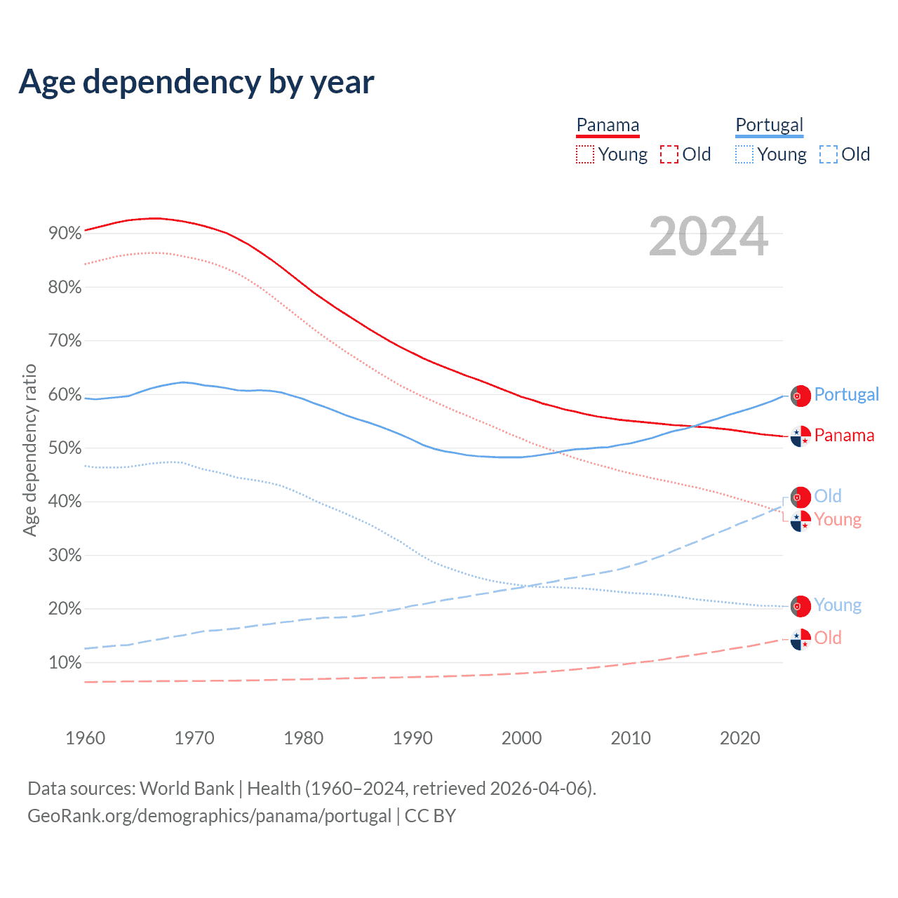 Data sources: World Bank | Health (1960–2024, retrieved 2026-04-06); U.S. Census Bureau (1960–2024, retrieved 2026-02-08).