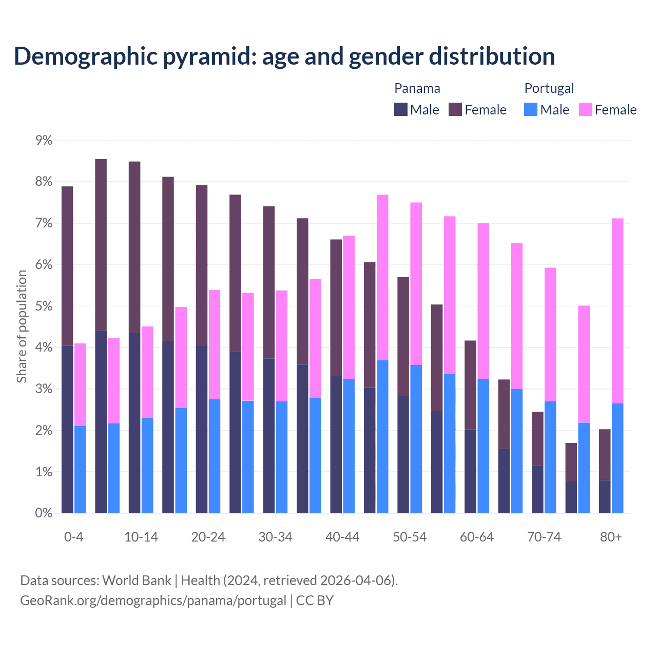 - The share of old-age demographic (65+) in Panama is 9.35% vs 24.5% in Portugal.